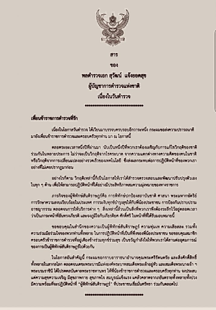 ในโอกาสอันสำคัญนี้ กระผมขอกราบอาราธนาอำนาจคุณพระศรีรัตนตรัย และสิ่งศักดิ์สิทธิ์ ทั้งหลายในสากลโลก ตลอดจนเดชะพระบารมีแห่งองค์พระบาทสมเด็จพระเจ้าอยู่หัว และสมเด็จพระนางเจ้า ฯพระบรมราชินี ได้โปรดดลบันดาลพระราชทานพร ให้พี่น้องข้าราชการตำรวจและครอบครัวทุกท่าน จงประสบแต่ความสุขความเจริญ มีสุขภาพกาย สุขภาพใจ สมบูรณ์แข็งแรง แคล้วคลาดจากภยันตรายทั้งหลายทั้งปวง มีความพร้อมที่จะปฏิบัติหน้าที่ “ผู้พิทักษ์สันติราษฎร์” ที่ประชาชนเชื่อมั่นศรัทธา ร่วมกันตลอดไป.”