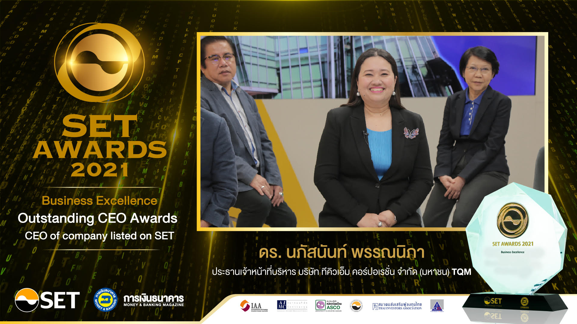 ขณะเดียวกันในงาน SET Awards 2021 นี้ ดร.นภัสนันท์ พรรณนิภา ประธานเจ้าหน้าที่บริหาร บริษัท ทีคิวเอ็ม คอร์ปอเรชั่น จำกัด (มหาชน ) ยังเป็นหนึ่งในผู้บริหารสูงสุดที่ได้รับรางวัล Outstanding CEO Awards 2021 จากรายชื่อผู้บริหารที่ถูกเสนอเข้าชิงรางวัล CEO Awards จำนวน 9 ราย ซึ่งเป็นรางวัลที่มอบให้แก่ผู้บริหารสูงสุดที่มีความเป็นผู้นำยอดเยี่ยม นำพาองค์กรสู่ความสำเร็จและยึดหลักธรรมาภิบาล มีคุณธรรมในการบริหารจัดการองค์กร ตลอดจนมีวิสัยทัศน์ มีความสามารถในเชิงกลยุทธ์ และให้ความสำคัญต่อสังคม พร้อมสนับสนุนการสร้างความยั่งยืนให้แก่องค์กร