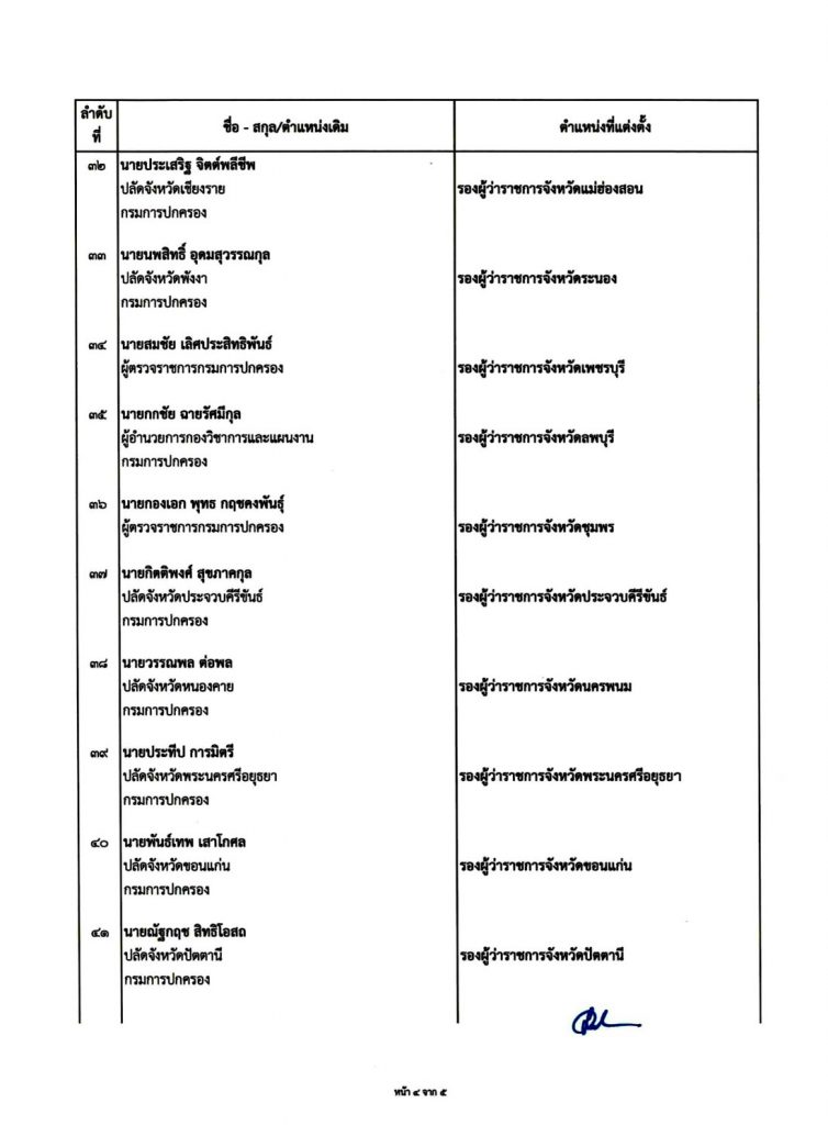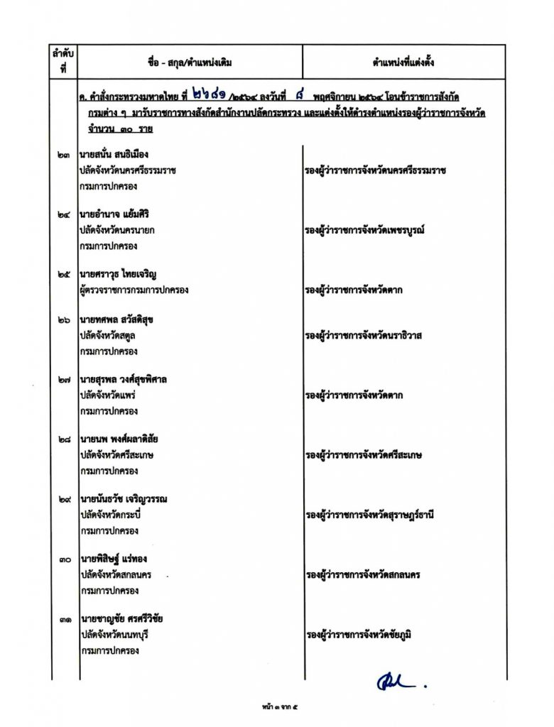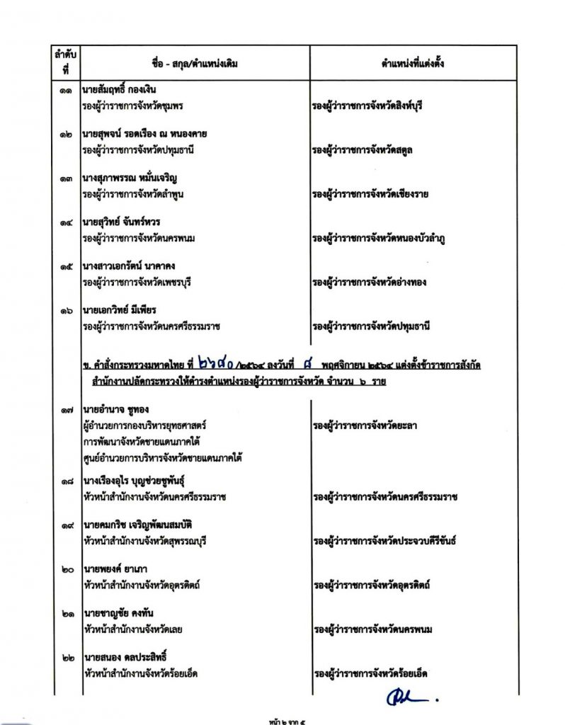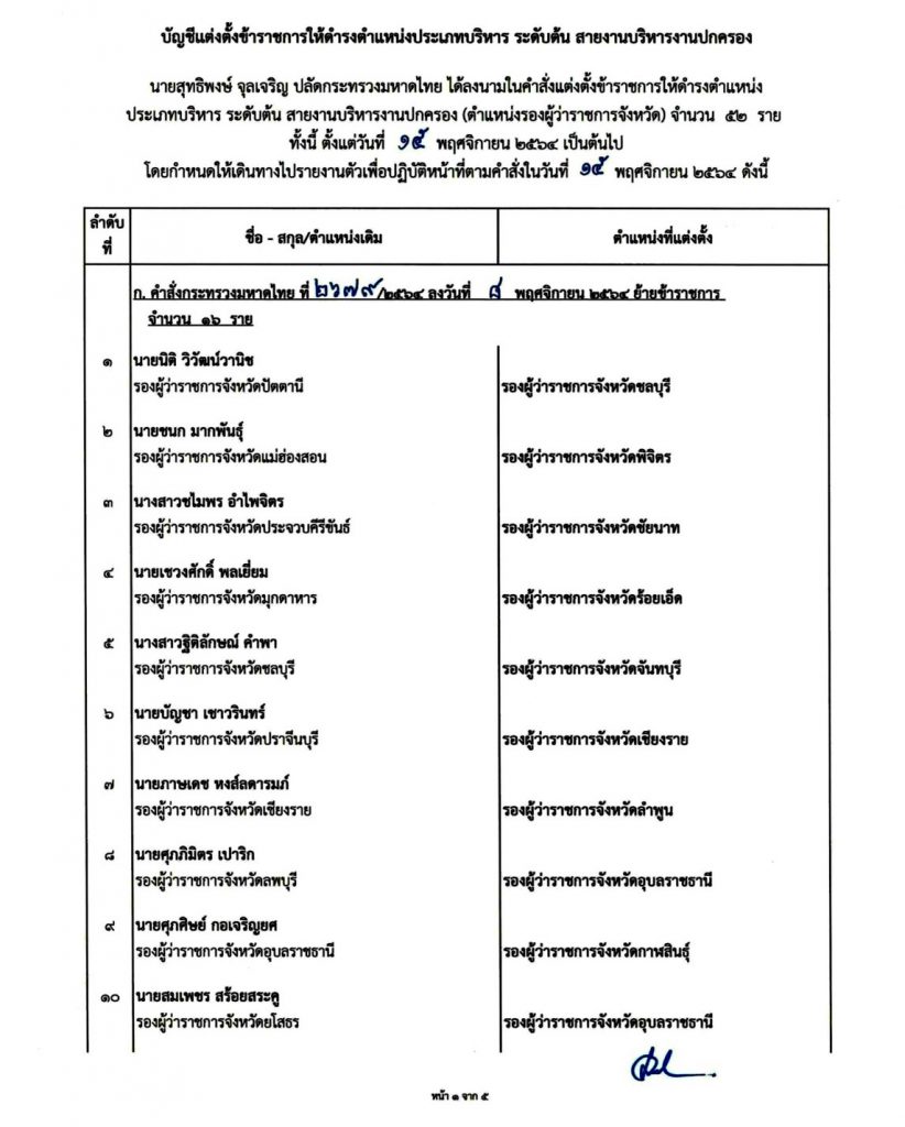 เมื่อวันที่ 8 พฤศจิกายน 2564 ผู้สื่อข่าวรายงานว่า นายสุทธิพงษ์ จุลเจริญ ปลัดกระทรวงมหาดไทย ได้ลงนามคำสั่งแต่งตั้งข้าราชการดำรงตำแหน่งประเภทบริหาร ระดับต้น สายงานบริหารงานปกครอง ตำแหน่งรองผู้ว่าราชการจังหวัด จำนวน 52 ราย เพื่อทดแทนผู้เกษียณอายุราชการ ทั้งนี้ ตั้งแต่วันที่ 15 พ.ย. 2564 เป็นต้นไป โดยกำหนดให้เดินทางไปรายงานตัวเพื่อปฎิบัติหน้าที่ ตามคำสั่งในวันที่ 15 พ.ย. 2564 มีรายชื่อดังต่อไปนี้