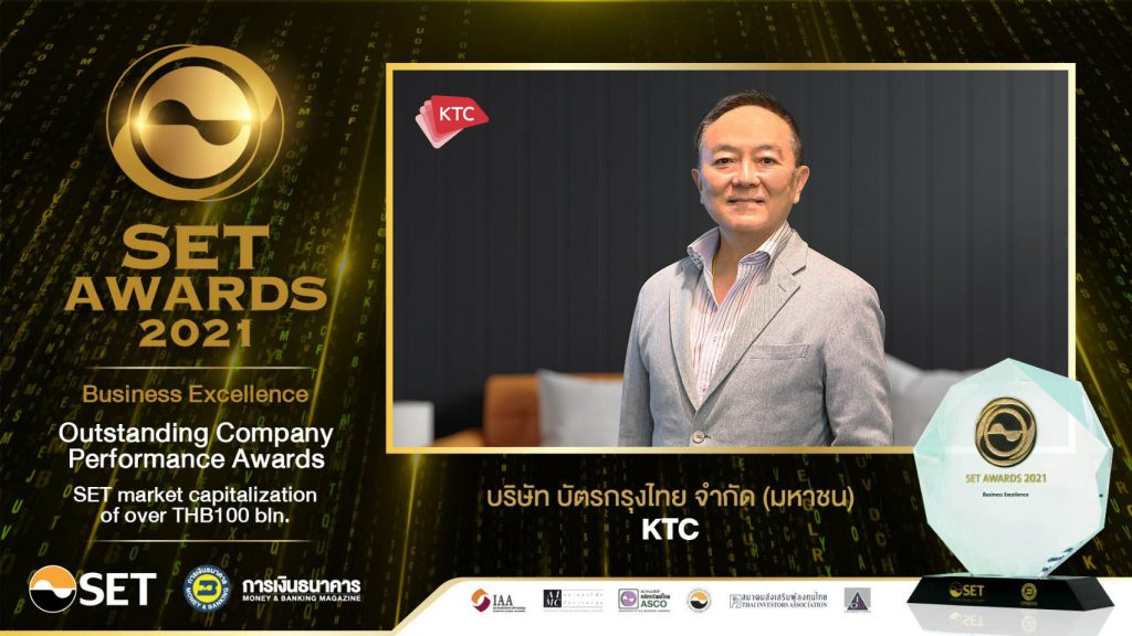 นายชุติเดช ชยุติ รองประธานเจ้าหน้าที่บริหารอาวุโส-คอร์ปอเรท ไฟแนนซ์ “เคทีซี” หรือ บริษัท บัตรกรุงไทย จำกัด (มหาชน) เป็นผู้แทนรับมอบโล่รางวัลบริษัทจดทะเบียนที่มีผลการดำเนินงานดีเด่น (Outstanding Company Performance Awards) ในกลุ่มรางวัลธุรกรรมทางการเงินยอดเยี่ยม (Business Excellence) ที่มีมูลค่าทางการตลาด (Market Capitalization) มากกว่า 1 แสนล้านบาทขึ้นไป และโล่ประกาศเกียรติคุณหุ้นยั่งยืนของ Thailand Sustainability Investment (THSI) ต่อเนื่องเป็นปีที่ 3 จากการที่ธุรกิจเคทีซีมีผลการดำเนินงานเติบโตก้าวหน้าต่อเนื่อง และมีส่วนร่วมพัฒนาสังคมไทยให้เติบโตอย่างยั่งยืน ในงาน “SET Awards 2021” การประกาศเกียรติคุณบริษัทจดทะเบียนที่มีความยอดเยี่ยมและดีเด่นในด้านต่างๆ ซึ่งปีนี้จัดขึ้นในรูปแบบออนไลน์ โดยตลาดหลักทรัพย์แห่งประเทศไทยร่วมกับวารสารการเงินธนาคาร เมื่อเร็วๆ นี้