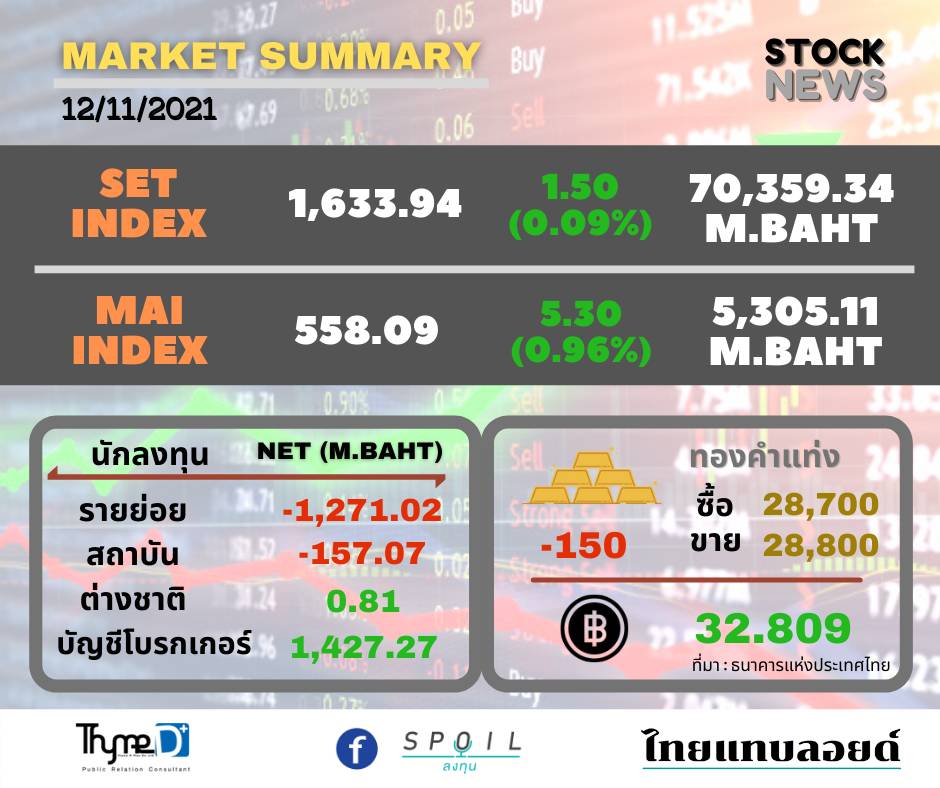 ตลาดหลักทรัพย์ ปิดวันนี้ที่ระดับ 1,633.94 จุด เพิ่มขึ้น 1.50 จุด (+0.09%) มูลค่าการซื้อขาย 70,359.34 ล้านบาท