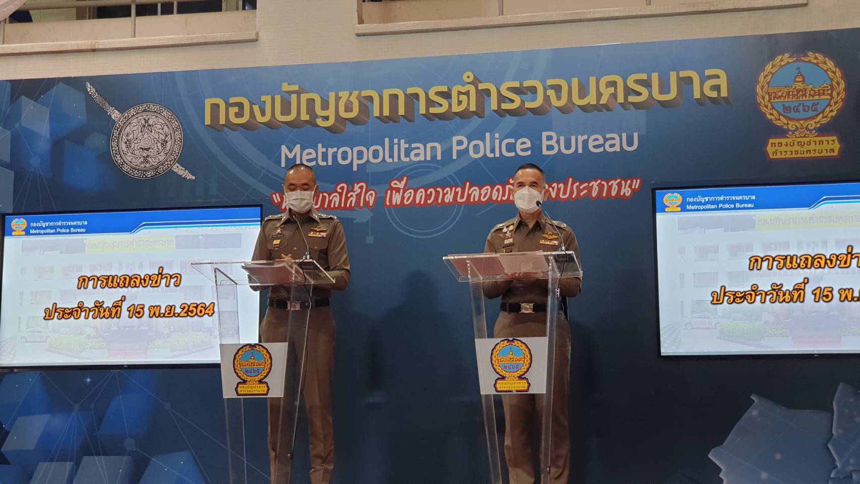 เมื่อเวลา 10.00 น. วันที่ 15 พฤศจิกายน 2564 พล.ต.ต.จิรสันต์ แก้วแสงเอก รอง ผบช.น. ในฐานะโฆษก บช.น. เปิดเผยถึงภาพรวมสถานการณ์การชุมนุมของกลุ่มแนวร่วมธรรมศาสตร์และการชุมนุม รวมถึงภาคีเครือข่าย ซึ่งมีผู้ชุมนุมได้รับบาดเจ็บจากการปะทะกันเมื่อวานนี้ โดยระบุว่าการเคลื่อนขบวนของผู้ชุมนุมเมื่อวานนี้ ผู้ชุมนุมพยายามทำลายแนวกั้นของตำรวจบริเวณแยกเฉลิมเผ่า และขว้างปาสิ่งของใส่เจ้าหน้าที่ จนมีตำรวจได้รับบาดเจ็บ 2 นาย ก่อนที่ผู้ชุมนุมจะเคลื่อนขบวนต่อไปยังหน้าสถาบันนิติเวช โรงพยาบาลตำรวจ และได้ขว้างปาระเบิดขึ้น เนื่องจากระยะประชิดอาจเกิดอันตรายกับตัวเจ้าหน้าที่ได้ ทำให้ตำรวจจำเป็นต้องยิงกระสุนยาง เพื่อป้องกันตนเอง และในเหตุชุลมุนบริเวณนี้ มีผู้ชุมนุมได้รับบาดเจ็บ 2 ราย จากนั้นที่บริเวณแยกวิทยุ หลังผู้ชุมนุมยื่นหนังสือที่สถานเอกอัครราชทูตเยอรมนี ประจำประเทศไทย ก็มีการขว้างปาระเบิดบริเวณแยกวิทยุ จนมีผู้ได้รับบาดเจ็บอีก 1 ราย