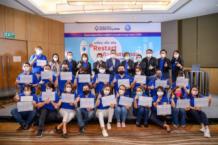 สมาคมผู้สื่อข่าวเศรษฐกิจ ร่วมกับ ธนาคารกรุงเทพ จำกัด (มหาชน) เปิดอบรมโครงการพัฒนาศักยภาพผู้สื่อข่าวเศรษฐกิจระดับสูง (พศส.) 2564 หัวข้อ “เปลี่ยนเพื่อปรับ Restart ธุรกิจ-อุตสาหกรรม-ฝ่ามหันตภัย โควิด-19” ได้รับเกียรติจาก คุณทวีลาภ ฤทธาภิรมย์ กรรมการผู้ช่วยผู้จัดการใหญ่ ธนาคารกรุงเทพ จำกัด (มหาชน) กล่าวปิดโครงการฯพร้อมมอบวุฒิบัตรและมอบรางวัลแก่กลุ่มผู้ชนะการนำเสนอรายงานของผู้เข้าร่วมอบรม โดยมี คุณพิมพ์รภัส ศิริไพรวัน นายกสมาคมผู้สื่อข่าวเศรษฐกิจ พร้อมด้วยคณะกรรมการบริหารสมาคมฯ ร่วมในพิธี