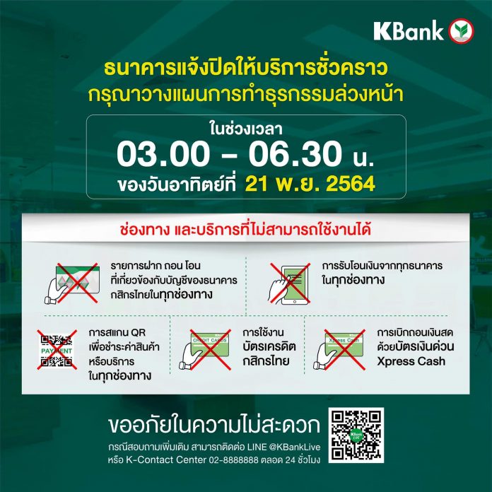 ธนาคารกสิกรไทยแจ้งปิดให้บริการชั่วคราว เพื่อพัฒนาระบบและเพิ่มประสิทธิภาพในการบริการให้ดียิ่งขึ้น ในวันอาทิตย์ที่ 21 พฤศจิกายน 2564 เวลา 03.00 น. – 06.30 น. ในช่วงเวลาดังกล่าวธนาคารจะงดให้บริการดังนี้ รายการฝาก ถอน โอนที่เกี่ยวข้องกับบัญชีของธนาคารกสิกรไทยในทุกช่องทาง การรับโอนเงินจากทุกธนาคารในทุกช่องทาง การสแกน QR เพื่อชำระค่าสินค้าหรือบริการในทุกช่องทาง การใช้งานบัตรเครดิตกสิกรไทย และการเบิกถอนเงินสดด้วยบัตรเงินด่วน Xpress Cash