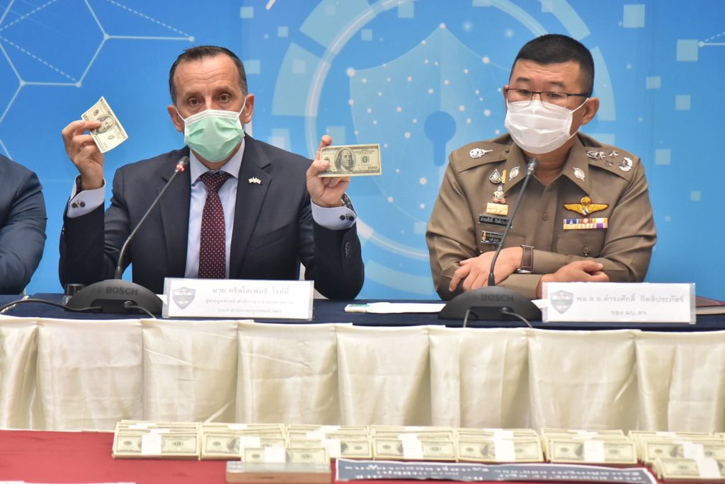 วันที่ 18 พฤศจิกายน 2564 เวลา 11.35 น. ที่สำนักงานตำรวจแห่งชาติ (ตร.) พล.ต.อ.ดำรงศักดิ์ กิตติประภัสร์ รอง ผบ.ตร. ในฐานะผู้อำนวยการศูนย์ปราบปรามอาชญากรรมทางเทคโนโลยีสารสนเทศ สำนักงานตำรวจแห่งชาติ (ศปอส.ตร.) หรือ PCT พร้อมด้วย พล.ต.ท.กิตติ์รัฐ พันธุ์เพ็ชร ผู้ช่วย ผบ.ตร., พล.ต.ท.ปรีชา เจริญสหายานนท์ ผู้ช่วย ผบ.ตร., พล.ต.ต.ฉัตรชัย นันทมงคล ผบก.พฐก.สพฐ.ตร., พล.ต.ต.นภันต์วุฒิ เลี่ยมสงวน ผบก.สส.ภ.8, พล.ต.ต.โชคชัย งามวงศ์ รอง ผบช.น. และ นายคริสโตเฟอร์ โรห์ดี้ (Mr.Christopher Rohde) ผู้ช่วยทูต/หัวหน้าสำนักงาน U.S. Secret Service ประจำสำนักงานกรุงเทพฯ ร่วมกันแถลงผลการสืบสวนขยายผลการจับกุมขบวนการผลิตธนบัตรดอลล่าร์สหรัฐอเมริกาปลอม โดยสามารถจับกุมนายทุนและผู้ร่วมขบวนการ พร้อมยึดแบงค์ดอลล่าร์ปลอมได้กว่า 10,000 ฉบับ คิดเป็นเงินไทย กว่า 30,000,000 บาท พร้อมบุกทลายโรงพิมพ์ได้อีก 1 แห่ง