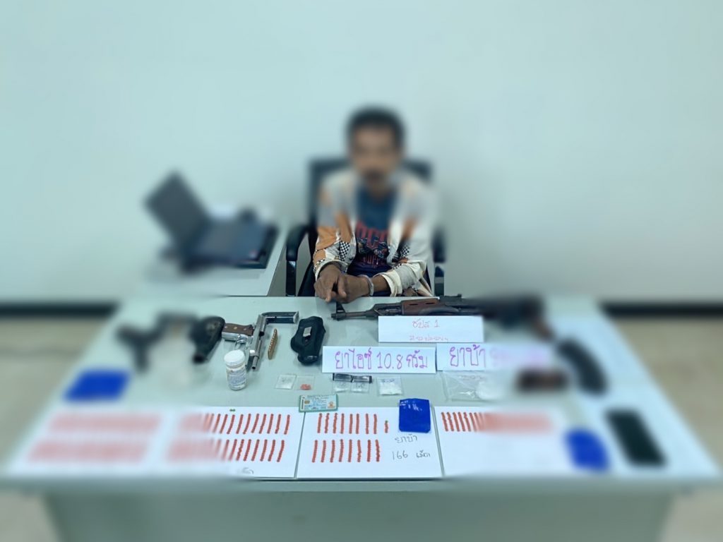 โดยกล่าวหาว่า (1.) “มียาเสพติดให้โทษประเภทที่ 1 (ยาบ้า, ไอซ์) ไว้ในความครอบครองเพื่อจำหน่ายโดยผิดกฎหมาย”, (2.) “เสพยาเสพติดให้โทษประเภทที่ 1 (เมทแอมเฟตามีน) โดยผิดกฎหมาย”, (3.) “มีอาวุธปืนและเครื่องกระสุนปืนที่นายทะเบียนไม่สามารถออกใบอนุญาตให้ไว้ได้ไว้ในความครอบครองโดยไม่ได้รับอนุญาต”, (4.) “มีอาวุธปืนและเครื่องกระสุนปืนไว้ในความครอบครองโดยไม่ได้รับอนุญาต”, (5.) “พกพาอาวุธปืนไปในเมือง หมู่บ้าน หรือทางสาธารณะโดยไม่ได้รับใบอนุญาตให้มีอาวุธปืนติดตัวโดยไม่มีเหตุจำเป็นเร่งด่วนตามสมควรแก่พฤติการณ์”