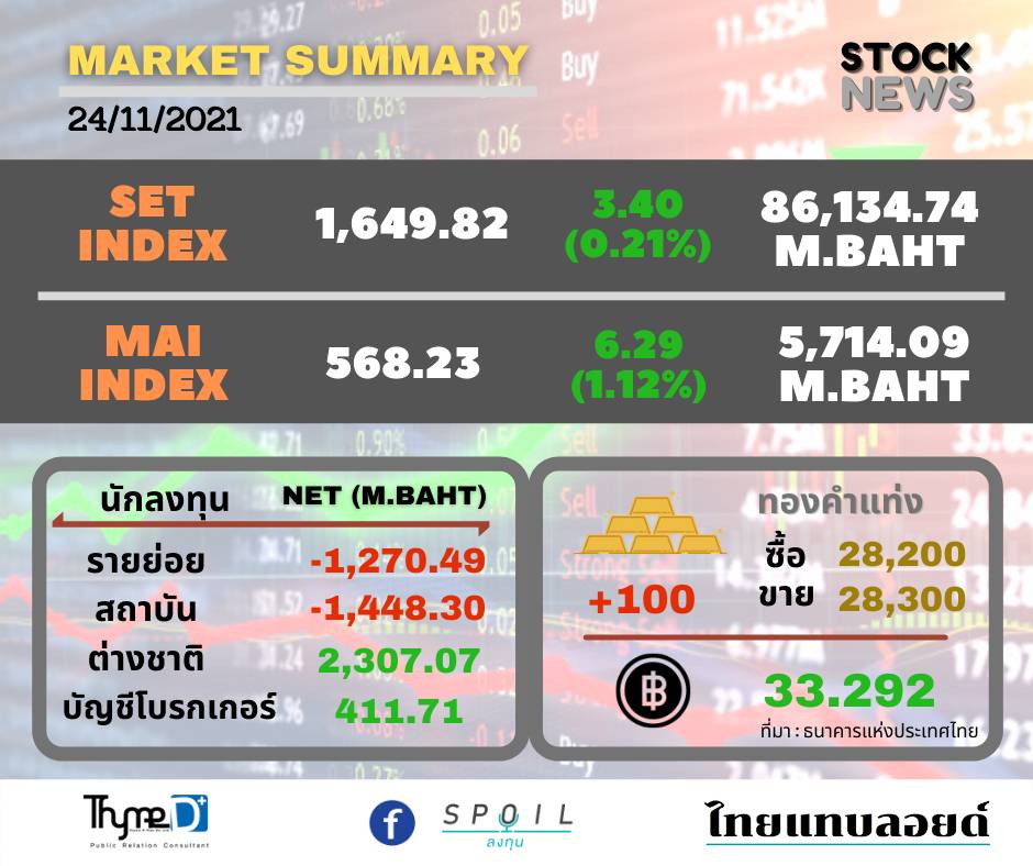 ตลาดหลักทรัพย์ ปิดวันนี้ที่ระดับ 1,649.82 จุด เพิ่มขึ้น 3.40 จุด (+0.21%) มูลค่าการซื้อขาย 86,134.74 ล้านบาท
