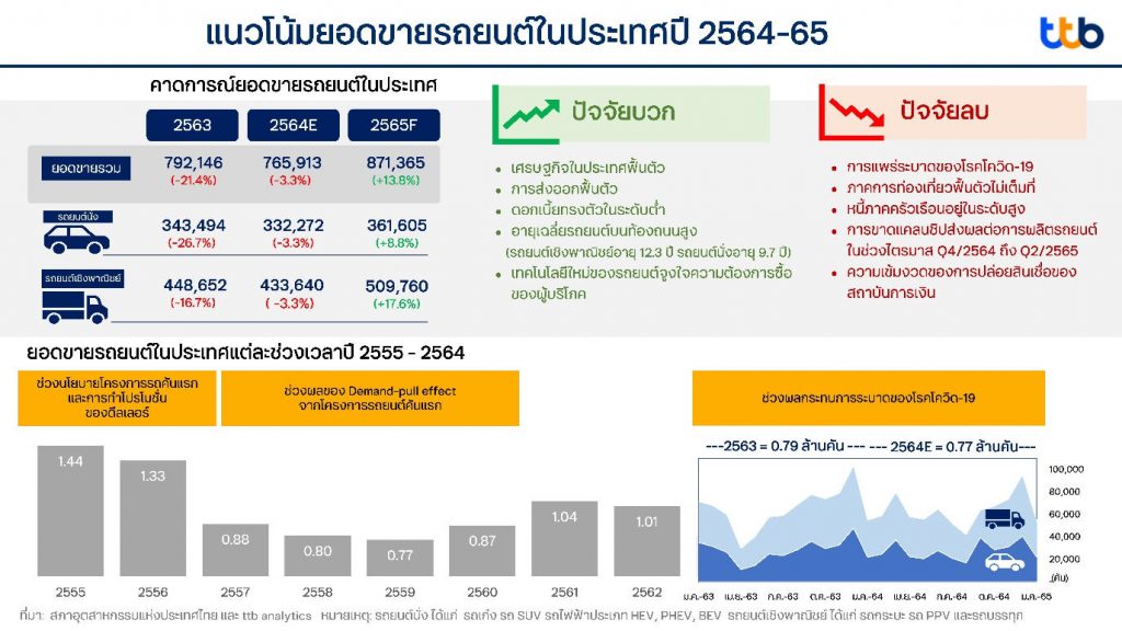 ศูนย์วิเคราะห์เศรษฐกิจ ทีทีบี หรือ ttb analytics ประเมินยอดขายรถยนต์ในประเทศปี 2564 อยู่ที่ 7.65 แสนคัน ลดลง 3.3% จากปีก่อน โดยปัจจัยฉุดรั้งมาจากการระบาดของโรคโควิด-19 และกำลังซื้อที่ชะลอตัว พร้อมคาดว่าในปี 2565 ยอดขายจะทยอยกลับมาสู่ระดับปกติ 8.7 แสนคัน หลังประชากรได้รับวัคซีนอย่างทั่วถึง และอายุเฉลี่ยรถยนต์บนท้องถนนเพิ่มขึ้น ชี้รถยนต์ไฟฟ้าประเภท Hybrid เป็นที่ต้องการของตลาดมากขึ้น