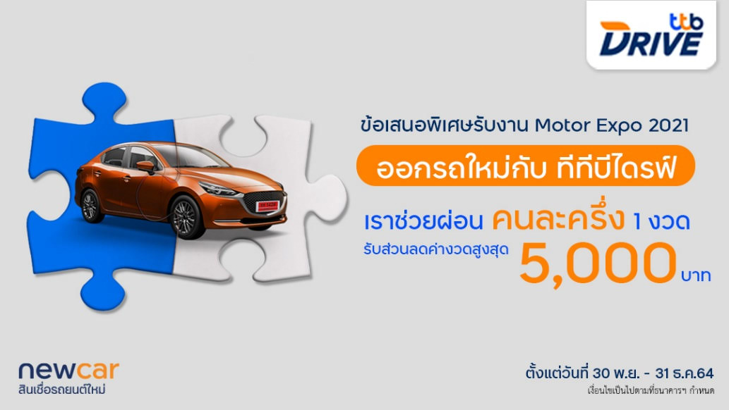 ทีทีบีไดรฟ์ (ttb DRIVE) สนับสนุนให้ลูกค้ามีชีวิตทางการเงินที่ดีขึ้น จัดโปรโมชันสุดพิเศษส่งท้ายปี ในงาน Motor Expo 2021 เมื่อออกรถยนต์ใหม่กับสินเชื่อรถยนต์ ttb DRIVE รับข้อเสนอสุดพิเศษ ช่วยผ่อนชำระค่างวด คนละครึ่ง หนึ่งงวด สูงสุด 5,000 บาท สำหรับลูกค้าที่ ชำระค่างวดติดต่อกันครบ 3 งวดแรกเต็มจำนวน และไม่เกินวันครบกำหนดชำระตามที่ระบุในสัญญาเช่าซื้อรถยนต์ เพียงสมัครสินเชื่อรถยนต์ใหม่ ttb DRIVE เปิดบัญชีทีทีบี ออลล์ฟรี (ttb all free) สมัครและเข้าใช้งานแอปพลิเคชัน ทีทีบี ทัช (ttb touch) ตั้งแต่ วันที่ 30 พ.ย. 64- 31 ธ.ค. 64 และได้รับการอนุมัติพร้อมทำสัญญาเช่าซื้อ ภายในวันที่ 28 ก.พ. 65 ทั้งภายในงานและทั่วประเทศ พร้อมรับฟรี ประกันอุบัติเหตุ (PA) วงเงินคุ้มครอง 30,000 บาท