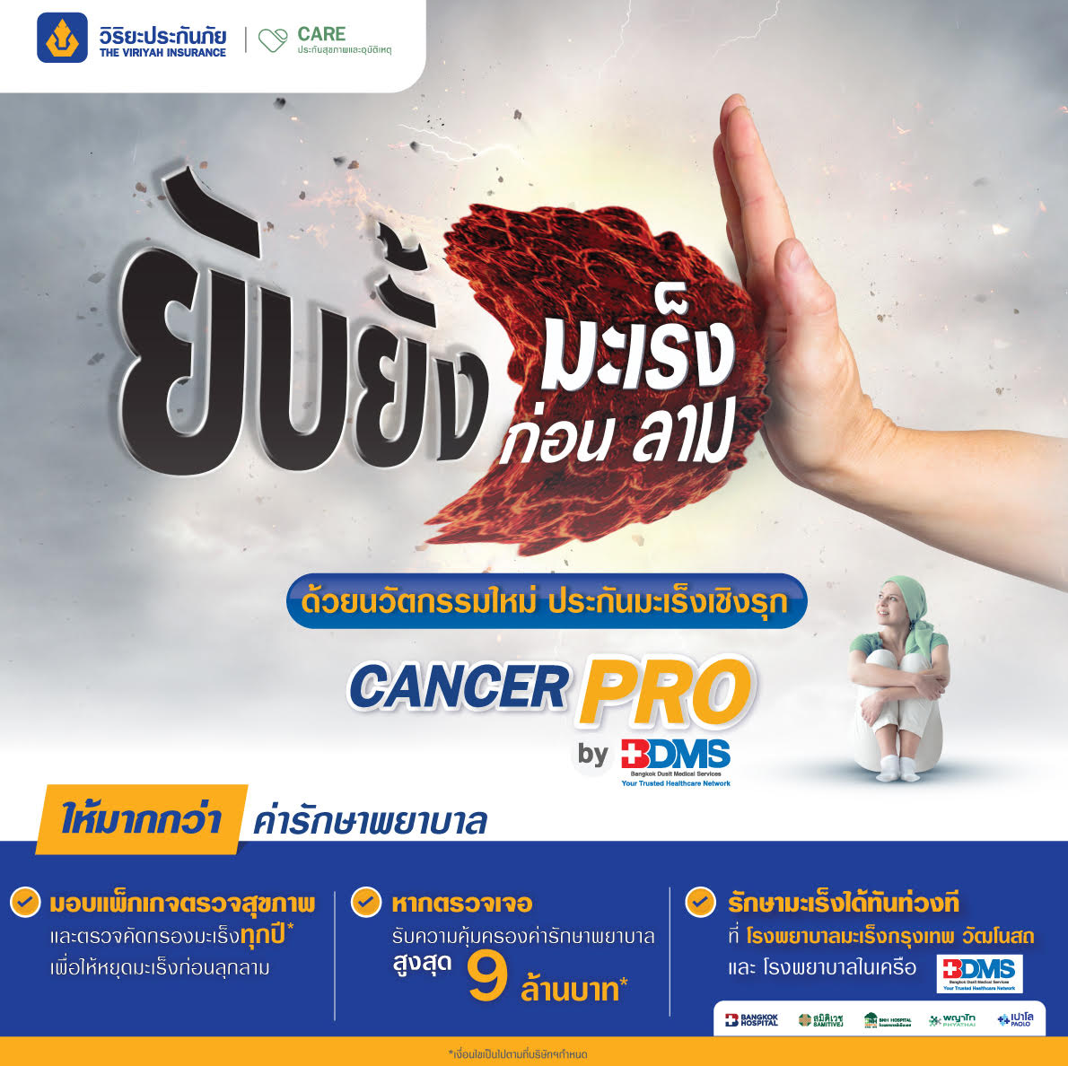 วิริยะประกันภัย-กรุงเทพดุสิตเวชการ ร่วมพัฒนาผลิตภัณฑ์ประกันภัยโรคมะเร็ง “Cancer Pro by BDMS” ฉีกแนวคิดแผนประกันภัยมะเร็งรูปแบบเดิมๆ ออกประกันมะเร็งเชิงรุก ยับยั้งมะเร็งก่อนลาม ให้มากกว่าค่ารักษาพยาบาล ด้วยแพ็กเกจตรวจสุขภาพและโปรแกรมตรวจคัดกรองมะเร็งให้ทุกปีเมื่อต่ออายุกรมธรรม์ เพื่อให้ตรวจเจอตั้งแต่ระยะเริ่มต้น ให้ผู้เอาประกันภัยได้เข้าถึงการรักษาที่มีคุณภาพด้วยเทคโนโลยีทางการแพทย์ที่ทันสมัยจากโรงพยาบาลในเครือ BDMS ที่เข้าร่วมโครงการ ครอบคลุมค่ารักษา ด้วยวงเงินความคุ้มครองค่ารักษาสูงสุด 9,000,000 บาท/ปี และ ค่าเบี้ยเริ่มต้นเพียงวันละ 20 บาท ทั้งยังนำเสนอผลิตภัณฑ์ประกันมะเร็งเชิงรุกนี้ผ่านช่องทางออนไลน์ในรูปแบบของ Interactive Ads.เพื่อให้ผู้บริโภคสามารถเลือกทางออกของมะเร็งได้