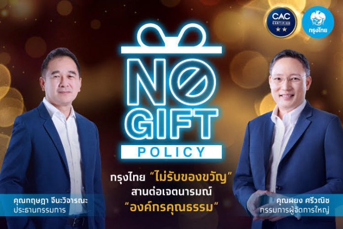 นายกฤษฎา จีนะวิจารณะ ประธานกรรมการ ธนาคารกรุงไทย นายผยง ศรีวณิช กรรมการผู้จัดการใหญ่ แสดงเจตนารมณ์ยึดมั่นนโยบาย NO Gift Policy งดรับของขวัญ ในเทศกาลวันปีใหม่ 2565 และในทุกเทศกาล โดยธนาคารกรุงไทยขอรับความปรารถนาดีผ่านคำอวยพร เพื่อร่วมกันสร้างวัฒนธรรมองค์กรที่ไม่ทนต่อการทุจริต และปลูกจิตสำนึกพนักงานในการปฏิบัติงานด้วยความซื่อสัตย์ สุจริต มีคุณธรรมและจริยธรรม ส่งเสริมบรรษัทภิบาลที่ดี ดำเนินการด้วยความโปร่งใส ต่อต้านการทุจริตคอร์รัปชัน พร้อมร่วมขับเคลื่อนธนาคาร ก้าวสู่ “องค์กรคุณธรรม” ต้นแบบที่มีมาตรฐานสากลและเป็นธนาคารที่ทุกคนไว้วางใจ