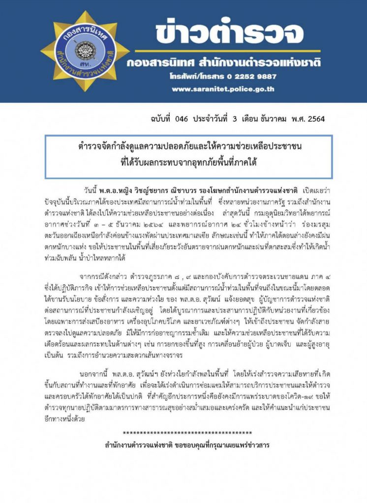 วันที่ 3 ธันวาคม 2564 พ.ต.อ.หญิง วิชญ์ชยากร ณิชาบวร รองโฆษกสำนักงานตำรวจแห่งชาติ เปิดเผยว่าปัจจุบันนี้บริเวณภาคใต้ของประเทศมีสถานการณ์น้ำท่วมในพื้นที่ ซึ่งหลายหน่วยงานภาครัฐ รวมถึงสำนักงานตำรวจแห่งชาติ ได้ลงไปให้ความช่วยเหลือประชาชนอย่างต่อเนื่อง ล่าสุดวันนี้ กรมอุตุนิยมวิทยาได้พยากรณ์อากาศช่วงวันที่ 3 – 5 ธันวาคม 2564 และพยากรณ์อากาศ 24 ชั่วโมงข้างหน้าว่า ร่องมรสุมตะวันออกเฉียงเหนือกำลังค่อนข้างแรงพัดผ่านประเทศมาเลเซีย ลักษณะเช่นนี้ ทำให้ภาคใต้ตอนล่างยังคงมีฝนตกหนักบางแห่ง ขอให้ประชาชนในพื้นที่เสี่ยงภัยระวังอันตรายจากฝนตกหนักและฝนที่ตกสะสมซึ่งทำให้เกิดน้ำท่วมฉับพลัน น้ำป่าไหลหลากได้ จากกรณีดังกล่าว ตำรวจภูธรภาค 8 , 9 และกองบังคับการตำรวจตระเวนชายแดน ภาค 4 ซึ่งได้ปฏิบัติภารกิจ เข้าให้การช่วยเหลือประชาชนตั้งแต่มีสถานการณ์น้ำท่วมในพื้นที่จนถึงในขณะนี้มาโดยตลอด ได้ขานรับนโยบาย ข้อสั่งการ และความห่วงใย ของ พล.ต.อ. สุวัฒน์ แจ้งยอดสุข ผู้บัญชาการตำรวจแห่งชาติ ต่อสถานการณ์ที่ประชาชนกำลังเผชิญอยู่ โดยได้บูรณาการและประสานการปฏิบัติกับหน่วยงานที่เกี่ยวข้อง โดยเฉพาะการส่งเสบียงอาหาร เครื่องอุปโภคบริโภค และยาเวชภัณฑ์ต่างๆ ให้เข้าถึงประชาชน จัดกำลังสายตรวจลงไปดูแลความปลอดภัย มิให้มีการก่ออาชญากรรมซ้ำเติม และให้ความช่วยเหลือประชาชนที่ได้รับความเดือดร้อนและผลกระทบในด้านต่างๆ เช่น การยกของขึ้นที่สูง การเคลื่อนย้ายผู้ป่วย ผู้บาดเจ็บ และผู้สูงอายุ เป็นต้น รวมถีงการอำนวยความสะดวกเส้นทางจราจร