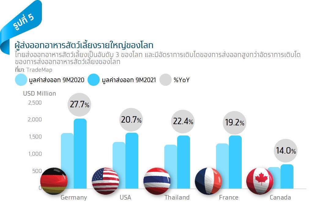 - ปรากฏการณ์ Pet Humanization หรือพฤติกรรมการเลี้ยงสัตว์เลี้ยงเสมือนหนึ่งสมาชิกในครอบครัวมีความเด่นชัดขึ้น ส่วนหนึ่งจากผลพวงของการระบาดของโควิด-19 ทำให้มูลค่าตลาดของธุรกิจเกี่ยวกับสัตว์เลี้ยงโลกมีแนวโน้มเติบโต และคาดว่าจะมีมูลค่าสูงถึง 217,651 ล้านเหรียญสหรัฐฯ หรือกว่า 6.9 ล้านล้านบาทในปี 2026 หรือ เติบโตเฉลี่ยปีละ 7.2% (CAGR) ขณะที่มูลค่าตลาดของธุรกิจเกี่ยวกับสัตว์เลี้ยงในไทยคาดว่าจะเติบโตสูงกว่าที่ 8.4% (CAGR) โดยคาดว่าจะอยู่ที่ 66,748 ล้านบาท ในปี 2026