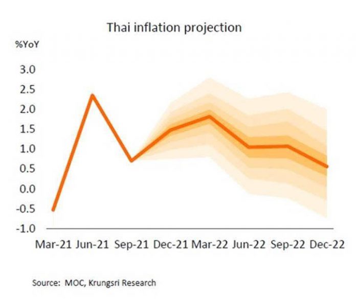 แม้อัตราเงินเฟ้อของไทยจะเร่งขึ้นในช่วงปลายปีนี้และมีแนวโน้มอาจแตะระดับสูงใกล้ 3% ในช่วงไตรมาส 1/2565 เนื่องจากผลของฐานที่ต่ำและการส่งผ่านของต้นทุน แต่คาดว่าจะชะลอลงและกลับมาแตะระดับใกล้ขอบล่างของกรอบเงินเฟ้อเป้าหมายของทางการที่ 1% ได้ในช่วงครึ่งหลังของปี 2565 ซึ่งสอดคล้องกับทิศทางราคาน้ำมันดิบในตลาดโลกที่มีแนวโน้มชะลอลง ประกอบกับอุปสงค์ในประเทศที่ฟื้นตัวอย่างค่อยเป็นค่อยไป จึงเอื้อให้กนง.ยังคงดอกเบี้ยนโยบายไว้ที่ระดับต่ำสุดเป็นประวัติการณ์ต่อเนื่อง เพื่อสนับสนุนการฟื้นตัวของเศรษฐกิจที่ยังมีความเปราะบางและเติบโตในอัตราที่ต่ำกว่าระดับศักยภาพ