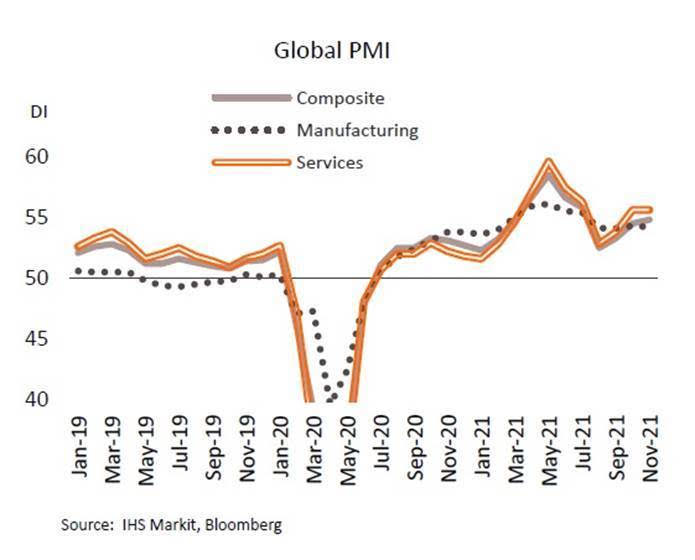 สำหรับเศรษฐกิจโลก วิจัยกรุงศรีระบุว่าเครื่องชี้เศรษฐกิจโลกเดือนพฤศจิกายนปรับตัวดีขึ้น แต่ไวรัสโอมิครอนเป็นปัจจัยเสี่ยงที่สำคัญในระยะต่อไป ในเดือนพฤศจิกายนดัชนีผู้จัดการฝ่ายจัดซื้อ (PMI) รวมภาคการผลิตและบริการของโลกแตะระดับสูงสุดนับตั้งแต่เดือนสิงหาคม 2564 ที่ 54.8 โดยดัชนีของกลุ่มประเทศแกนหลัก อาทิ ยูโรโซน ญี่ปุ่น ปรับดีขึ้นสู่ระดับ 55.8 และ 53.3 ตามลำดับ สะท้อนการขยายตัวต่อเนื่อง (ค่าดัชนี > 50) ของกิจกรรมในภาคการผลิตและภาคบริการ โดยองค์ประกอบของดัชนี PMI ของโลกปรับตัวดีขึ้นทั้งด้านผลผลิต ยอดสั่งซื้อใหม่ ยอดสั่งซื้อเพื่อการส่งออก และการจ้างงาน อย่างไรก็ตาม องค์ประกอบทางด้านราคาบ่งชี้ว่าแรงกดดันเงินเฟ้อยังเพิ่มสูงขึ้นจากปัจจัยด้านต้นทุนการผลิตที่ได้รับผลกระทบจากปัญหาข้อจำกัดด้านอุปทานและราคาสินค้าโภคภัณฑ์โดยเฉพาะน้ำมันที่พุ่งขึ้น