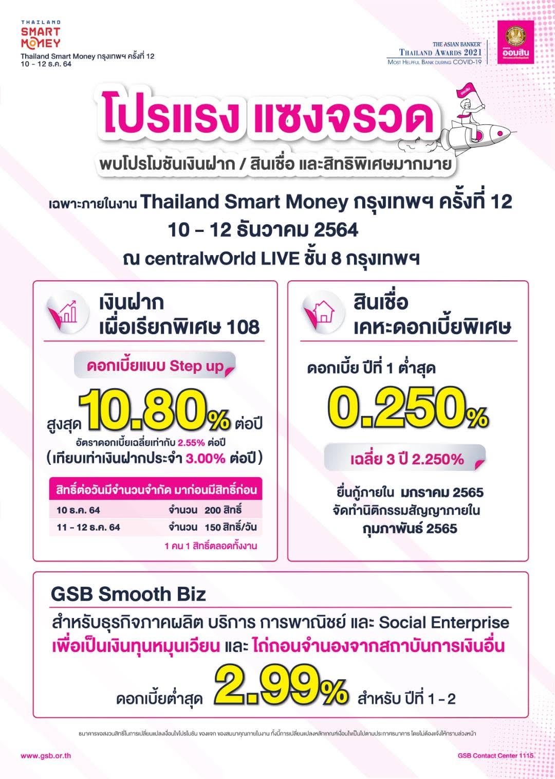 นายวิทัย รัตนากร ผู้อำนวยการธนาคารออมสิน เปิดเผยว่า ธนาคารได้จัดโปรโมชันน่าสนใจเข้าร่วมงาน Thailand Smart Money กรุงเทพฯ 2021 ครั้งที่ 12 ระหว่างวันที่ 10-12 ธันวาคม 2564 อีกหนึ่งงานสำคัญที่จะกระตุ้นเศรษฐกิจ และช่วยเหลือให้พี่น้องประชาชนได้เข้าถึงแหล่งเงินกู้ในระบบได้อย่างทั่วถึงด้วยหลักเกณฑ์เงื่อนไขที่ผ่านปรน รวมถึงโปรโมชันเงินฝากที่มีอัตราดอกเบี้ยจูงใจ ได้แก่ เงินฝากเผื่อเรียกพิเศษ 108 ดอกเบี้ยแบบ Step up สูงสุด 10.80% ต่อปี หรืออัตราดอกเบี้ยเฉลี่ยเท่ากับ 2.55% ต่อปี เทียบเท่าเงินฝากประจำ 3.00% ต่อปี และ สลากออมสินพิเศษ 2 ปี (แบบมีใบสลาก) ได้ร่วมลุ้นเงินรางวัลพิเศษ 1 ล้านบาท จำนวน 10 รางวัล ซึ่งจะออกรางวัลในวันที่ 30 ธ.ค.64 ไม่นับรวมการออกรางวัลปกติรวม 24 ครั้ง มีรางวัลที่ 1 จำนวนเงิน 5,000,000 บาท โดยดอกเบี้ยและเงินรางวัลจะได้รับการยกเว้นภาษี