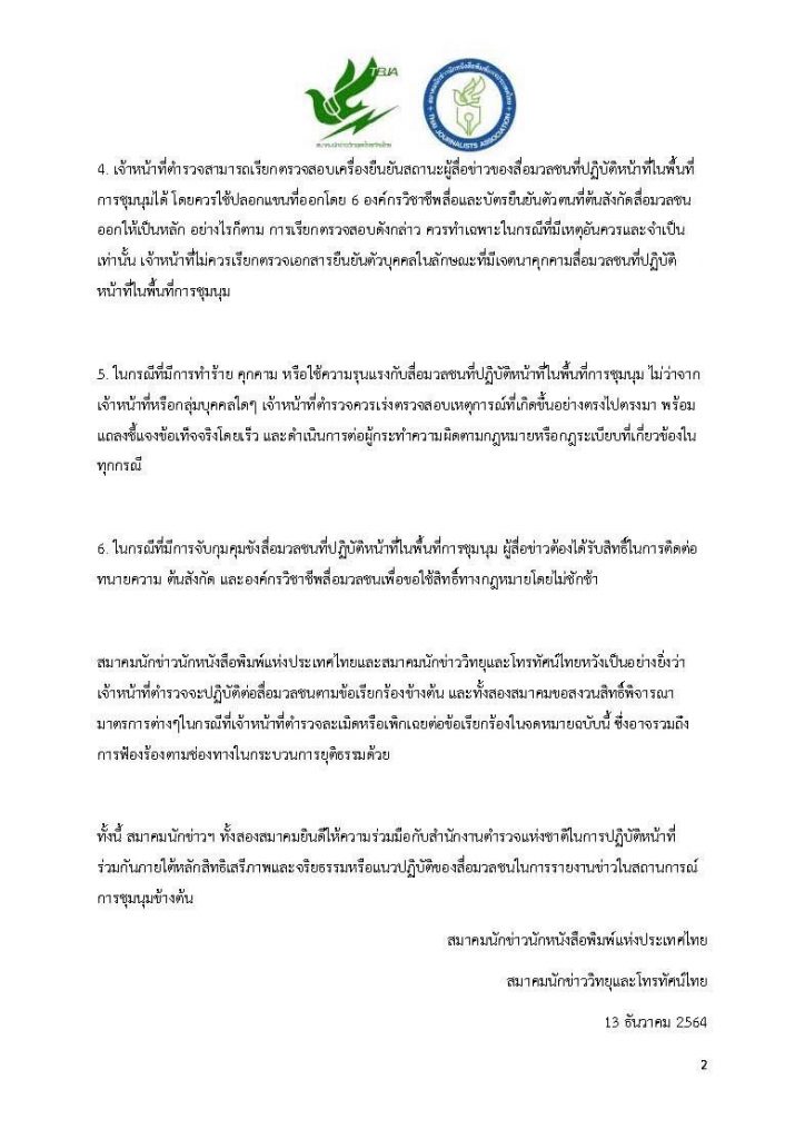เมื่อวันที่ 13 ธันวาคม 2564 ผู้สื่อข่าวไทยแทบลอยด์รายงานว่าสมาคมนักข่าวนักหนังสือพิมพ์แห่งประเทศไทย และสมาคมนักข่าววิทยุและโทรทัศน์ไทยได้ มีจดหมายเปิดผนึกถึงสำนักงานตำรวจแห่งชาติ เรื่อง แนวทางปฏิบัติสื่อมวลชนที่ทำหน้าที่ในสถานการณ์การชุมนุม มีใจความระบุว่า “สมาคมนักข่าวนักหนังสือพิมพ์แห่งประเทศไทย และสมาคมนักข่าววิทยุและโทรทัศน์ไทย เป็นองค์กรวิชาชีพสื่อมวลชนที่มีภารกิจร่วมกันในการรณรงค์ให้สื่อมวลชนแขนงต่างๆ สามารถปฏิบัติหน้าที่ตามหลักวิชาชีพในสถานการณ์การชุมนุมได้อย่างปลอดภัย ปราศจากการคุกคามต่อชีวิตและเสรีภาพ ตามหลักการสิทธิเสรีภาพสื่อมวลชนซึ่งได้รับการคุ้มครองภายใต้รัฐธรรมนูญ