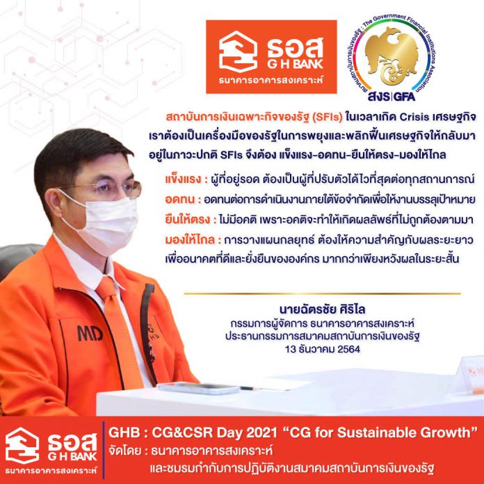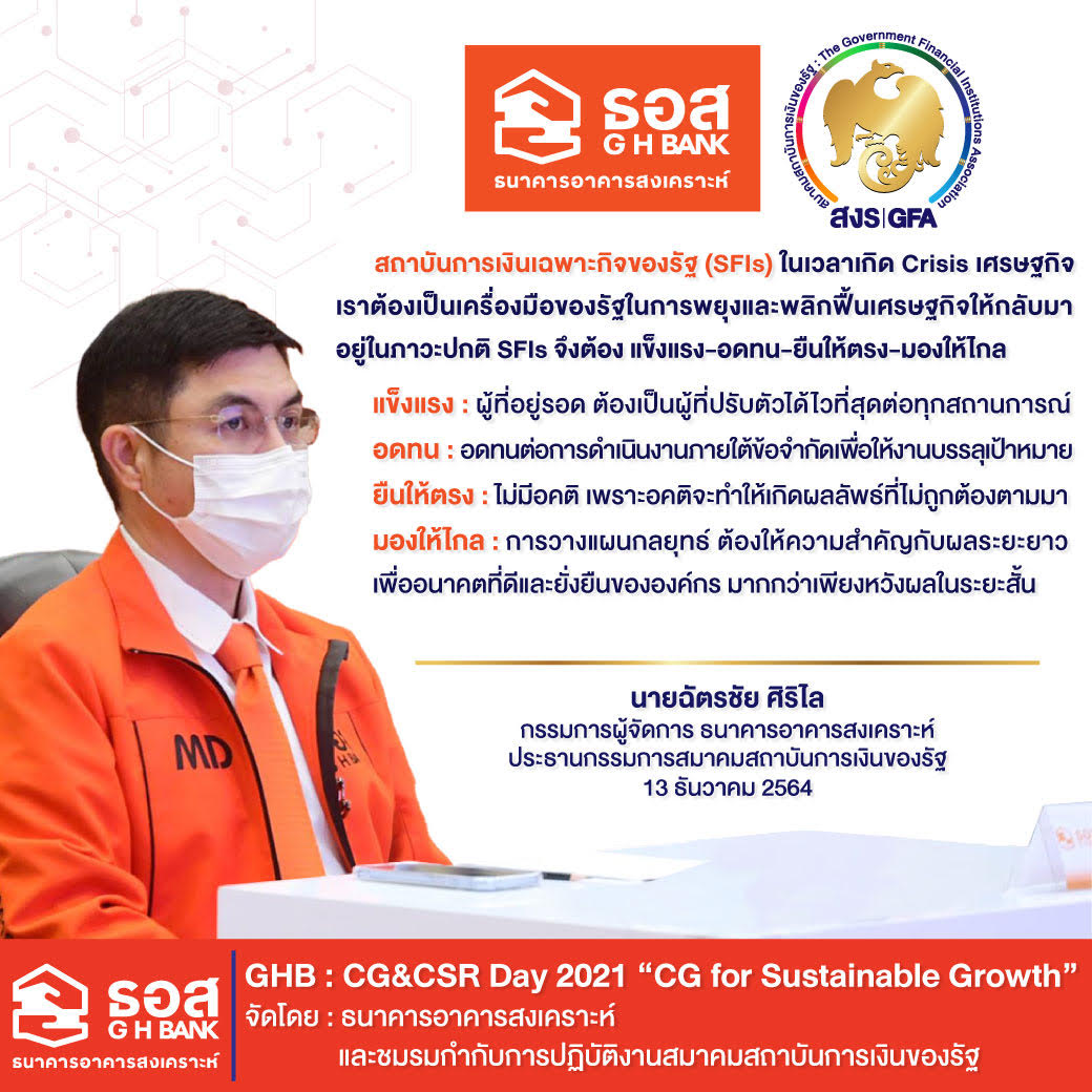 นายฉัตรชัย ศิริไล กรรมการผู้จัดการ ธนาคารอาคารสงเคราะห์ (ธอส.) ในฐานะประธานกรรมการสมาคมสถาบันการเงิน ของรัฐ กล่าวปาฐกถาพิเศษ ในงาน GHB : CG & CSR Day 2021 “CG for Sustainable Growth” หัวข้อ “CG for SFIs’s Sustainable Growth” ซึ่งจัดโดย ธนาคารอาคารสงเคราะห์ ร่วมกับ ชมรมกำกับการปฏิบัติงานสมาคมสถาบันการเงิน ของรัฐ เพื่อส่งเสริมการดำเนินงาน พัฒนาความรู้ ความเข้าใจ ตามหลักการกำกับดูแลกิจการที่ดีและความรับผิดชอบต่อสังคมและสิ่งแวดล้อมให้กับบุคลากรของสถาบันการเงินของรัฐ โดยมี ดร.กิริฎา เภาพิจิตร ประธานคณะกรรมการกำกับดูแลกิจการ