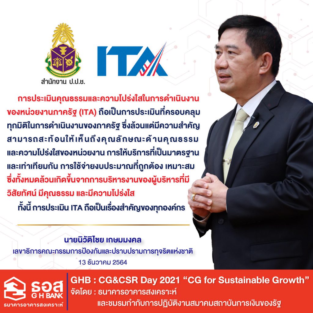 ที่ดีและความรับผิดชอบต่อสังคมและสิ่งแวดล้อม (CG & CSR) ธอส. เป็นประธานเปิดงาน และยังได้รับเกียรติจาก นายประจักษ์ บุญยัง ผู้ว่าการตรวจเงินแผ่นดิน บรรยายหัวข้อ “การตรวจเงินแผ่นดินเพื่อการพัฒนาที่ยั่งยืน” และนายนิวัติไชย เกษมมงคล เลขาธิการคณะกรรมการป้องกันและปราบปรามการทุจริตแห่งชาติ บรรยายหัวข้อ “ทิศทางการพัฒนาการประเมินคุณธรรมและความโปร่งใส ในการดำเนินงานของหน่วยงานภาครัฐ” โดยมีผู้บริหารของสถาบันการเงินของรัฐ 8 แห่ง ประกอบด้วย ธนาคารอาคารสงเคราะห์ ธนาคารเพื่อการเกษตรและสหกรณ์การเกษตร ธนาคารออมสิน ธนาคารกรุงไทย จำกัด (มหาชน) ธนาคารเพื่อการส่งออกและนำเข้าแห่งประเทศไทย ธนาคารพัฒนาวิสาหกิจขนาดกลางและขนาดย่อมแห่งประเทศไทย ธนาคารอิสลามแห่งประเทศไทย และ บรรษัทประกันสินเชื่ออุตสาหกรรมขนาดย่อม เข้าร่วมงานอย่างพร้อมเพรียงภายใต้มาตรการป้องกันการแพร่ระบาดของ COVID-19