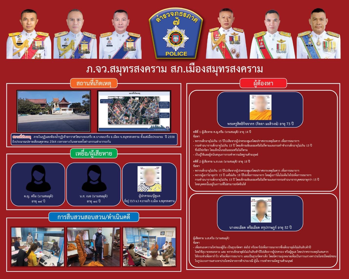 สภ.เมืองสมุทรสงคราม และเจ้าหน้าที่ตำรวจที่เกี่ยวข้อง ได้ร่วมกันแถลงข่าวการจับกุมคดีที่ประชาชนให้ความสนใจ และสั่งการให้พนักงานสอบสวน สภ.เมืองสมุทรสงคราม โดยแจ้งข้อกล่าวหากับผู้ต้องหา ทั้ง 2 ราย นายกิจจา มะลิวงษ์ อดีตเจ้าอาวาสวัดบางจะเกร็งอายุ 73 ปี ผู้ต้องหาที่ 1 ข้อหาพรากเด็กอายุไม่เกิน 15 ปี ไปเสียจากผู้ปกครองดูแลโดยปราศจากเหตุอันควร เพื่อการอนาจาร, พรากผู้เยาว์อายุกว่า 15 ปี แต่ไม่เกิน 18 ปี ไปเพื่อการอนาจาร โดยผู้เยาว์นั้นไม่เต็มใจไปเพื่อการอนาจาร กระทำอนาจารเด็กอายุไม่เกิน 15 ปี โดยเด็กจะยินยอมหรือไม่ก็ตามและการกระทำอนาจารบุคคลอายุกว่า 15 ปี โดยบุคคลนั้นอยู่ในภาวะที่ไม่สามารถขัดขืนได้, กระทำอนาจารเด็กอายุไม่เกิน 15 ปี โดยเด็กจะยินยอมหรือไม่ก็ตามและกระทำชำเราเด็กอายุไม่เกิน 13 ปี ซึ่งมิใช่ภริยา โดยเด็กนั้นจะยินยอมหรือไม่ก็ตาม, เป็นผู้ใช้และผู้สนับสนุนการกระทำความผิดฐานค้ามนุษย์, นางละเอียด หรือเอียด สรุปราษฎร์ อายุ 52 ปีผู้ต้องหาที่ 2 ในข้อหาเพื่อสนองความใคร่ของผู้อื่น เป็นธุระจัดหา ล่อไป หรือพาไปเพื่อการอนาจารซึ่งเด็กอายุยังไม่เกิน 15 ปี โดยใช้อุบายหลอกลวง และพรากเด็กอายุยังไม่เกิน 15 ปี ไปเสียจากผู้ปกครอง หรือผู้ดูแลโดยปราศจากเหตุอันสมควร ได้กระทำเพื่อหากำไร หรือเพื่อการอนาจาร และเป็นธุระจัดหาเด็ก โดยมีความมุ่งหมายเพื่อเป็นการแสวงหาประโยชน์โดยมิชอบ ในรูปแบบการแสวงหาประโยชน์จากการค้าประเวณีผู้นั้นกระทำความผิดฐานค้ามนุษย์