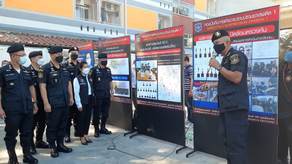 เมื่อเวลา 10.00 น. วันที่ 28 ธันวาคม 2564 ที่บริเวณด้านหน้าร้านเซเว่น อีเลฟเว่น สาขารามอินทรา 39 แยก 3 แขวงท่าแร้ง เขตบางเขน กรุงเทพฯ ใกล้ชุมชนจามจุรี พล.ต.ท.สรายุทธ สงวนโภคัย ผบช.ปส. ร่วมกับหน่วยงานที่เกี่ยวข้อง แถลงผลการปฏิบัติ ตามยุทธการสยบไพรี 65/3 ชุมชนจามจุรี ปลอดภัยยาเสพติดรับปีใหม่ มีเป้าหมายเข้าตรวจค้น 15 จุด 10 หมาย