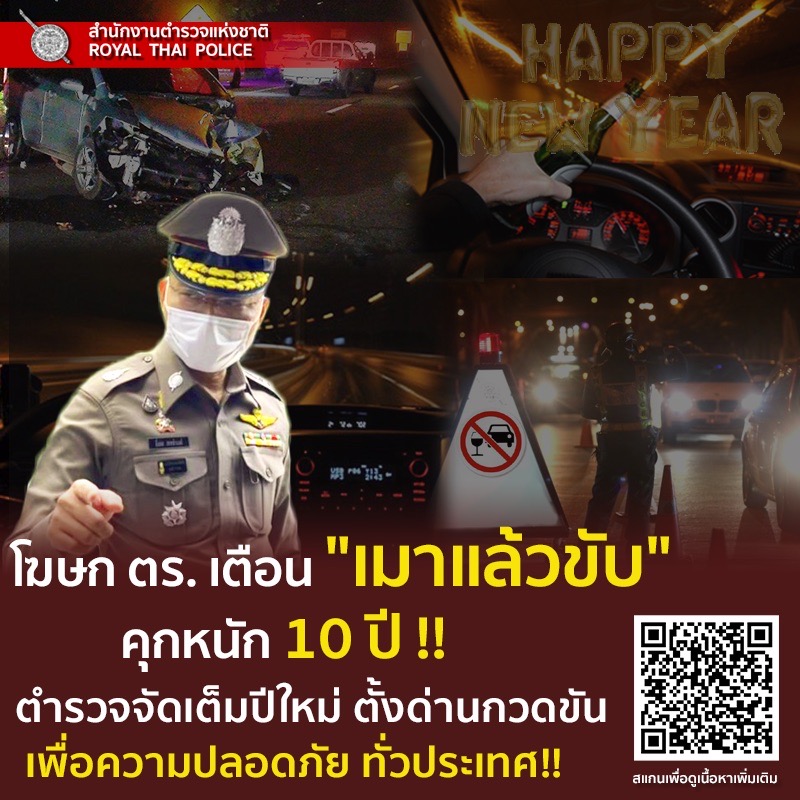 สำนักงานตำรวจแห่งชาติ ขอแสดงความห่วงใยกับพี่น้องประชาชน ไม่ขับขี่รถในขณะเมาสุรา หรือของเมาอย่างอื่น เพื่อลดความสูญเสีย และอุบัติเหตุบนท้องถนน ขอให้พี่น้องประชาชนเดินทาง อย่างปลอดภัย มีความสุขกับเทศกาลปีใหม่ 2565 และหากท่านใดพบการกระทำความผิด ขอให้แจ้งไปยัง สายด่วน 191 หรือสายด่วนสำนักงานตำรวจแห่งชาติ 1599 ได้ตลอด 24 ชั่วโมง