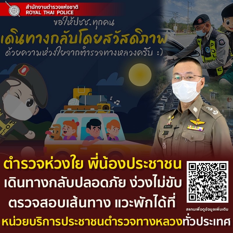 สำนักงานตำรวจแห่งชาติ ขอแสดงความห่วงใยกับพี่น้องประชาชน ขอให้ขับขี่ด้วยความปลอดภัย มีน้ำใจให้เพื่อนร่วมทาง ปฏิบัติตามกฎหมาย ง่วงและเมาไม่ขับ ขอให้เดินทางกลับบ้านโดยสวัสดิภาพ หากมีข้อสงสัยในเรื่องเส้นทาง สามารถติดต่อสายด่วนตำรวจทางหลวง 1193 หรือหากพบการกระทำผิดกฎหมาย ขอให้แจ้งไปยังสายด่วน 191 หรือสายด่วนสำนักงานตำรวจแห่งชาติ 1599 ได้ตลอด 24 ชั่วโมง