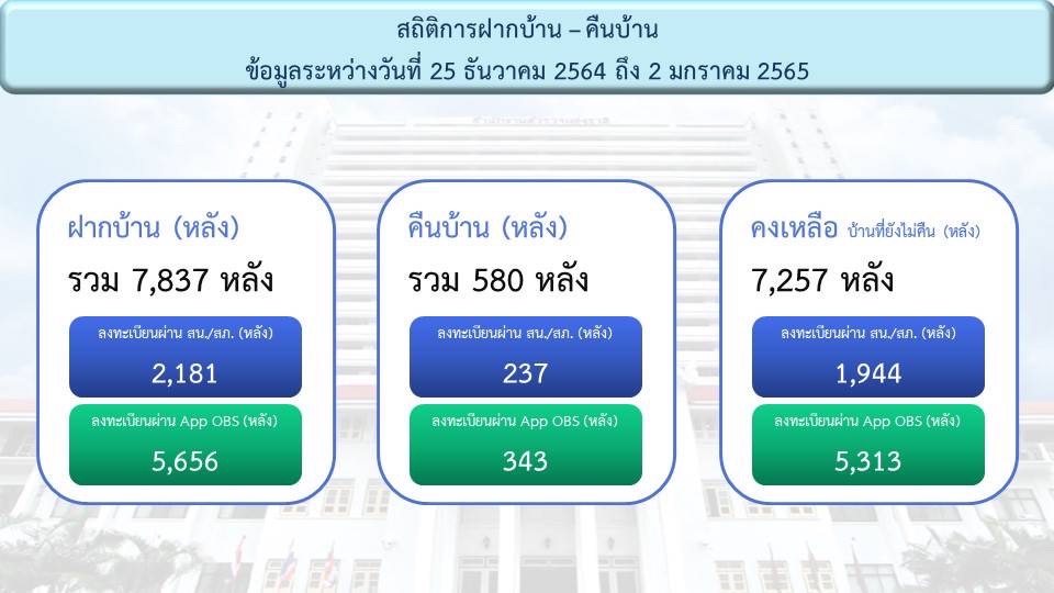 ซึ่งล่าสุดได้มีการมอบคืนบ้าน แล้ว รวม 580 หลังโดย ลงทะเบียนผ่าน สน.,สภ. 237 หลัง และลงทะเบียนผ่าน App OBS 343 หลัง คงเหลือบ้าน ที่ยังไม่ส่งคืน 7,257.หลัง ซึ่งลงทะเบียนผ่าน สน.,สภ. 1,944.หลัง ลงทะเบียนผ่าน App OBS 5,313 หลัง