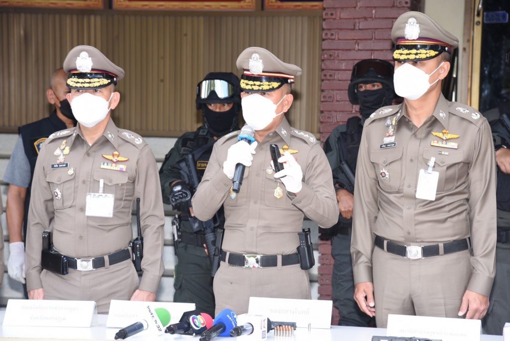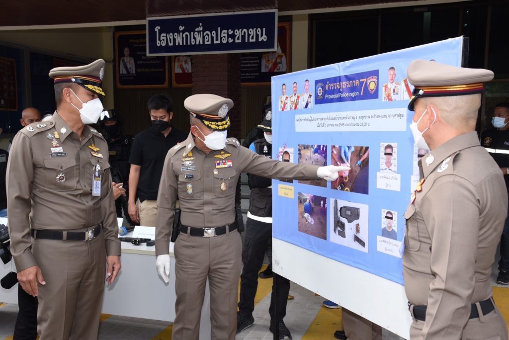 ผบช.ภ.7 พร้อมด้วย พล.ต.ต.ปรัชญา ประสานสุข รอง ผบช.ภ.7, พล.ต.ต.ชมชวิณ ปุระธนานนท์ ผบก.ภ.จว.นครปฐม, พ.ต.อ.สุรชัย สุกใส รอง ผบก.ภ.จว.นครปฐม, พ.ต.อ.ธนบดี บุญพา นวท.(สบ.4) ศพฐ.7, พ.ต.อ.ธีรเชษฐ์ ธนวินรวีร์ ผกก.สภ.กำแพงแสน และเจ้าหน้าที่ตำรวจที่เกี่ยวข้อง ได้ร่วมกันแถลงข่าวการจับกุมตัวผู้ต้องหา นายธนัท หรือเอ็ม จ้อยร่อย อายุ 40 ปี ผู้ต้องหาตามหมายจับศาลจังหวัดนครปฐม ที่ จ.1/2565 ลงวันที่ 2 มกราคม 2565 ซึ่งต้องหาว่ากระทำผิดฐาน “ฆ่าผู้อื่น,พยายามฆ่าผู้อื่น,มีอาวุธปืนและเครื่องกระสุนปืนไว้ในความครอบครองโดยไม่ได้รับอนุญาต,พาอาวุธปืนติดตัวไปในเมืองหมู่บ้าน ทางสาธารณะ โดยไม่ได้รับอนุญาต โดยไม่มีเหตุจำเป็นและเร่งด่วนตามสมควรแก่พฤติการณ์, ยิงปืนซึ่งใช้ดินระเบิดโดยใช่เหตุในเมือง หมู่บ้าน หรือที่ชุมชน” พร้อมด้วยของกลางในคดี 1) อาวุธปืนพกสั้นกึ่งอัตโนมัติ ขนาด 9 มม. ยี่ห้อ CZ รุ่น 75 P-01 จำนวน 1 กระบอก, 2) ซองกระสุนปืน ขนาด 9 มม. จำนวน 1 อัน, 3)เครื่องกระสุนปืนขนาด 9 มม. จำนวน 16 นัด