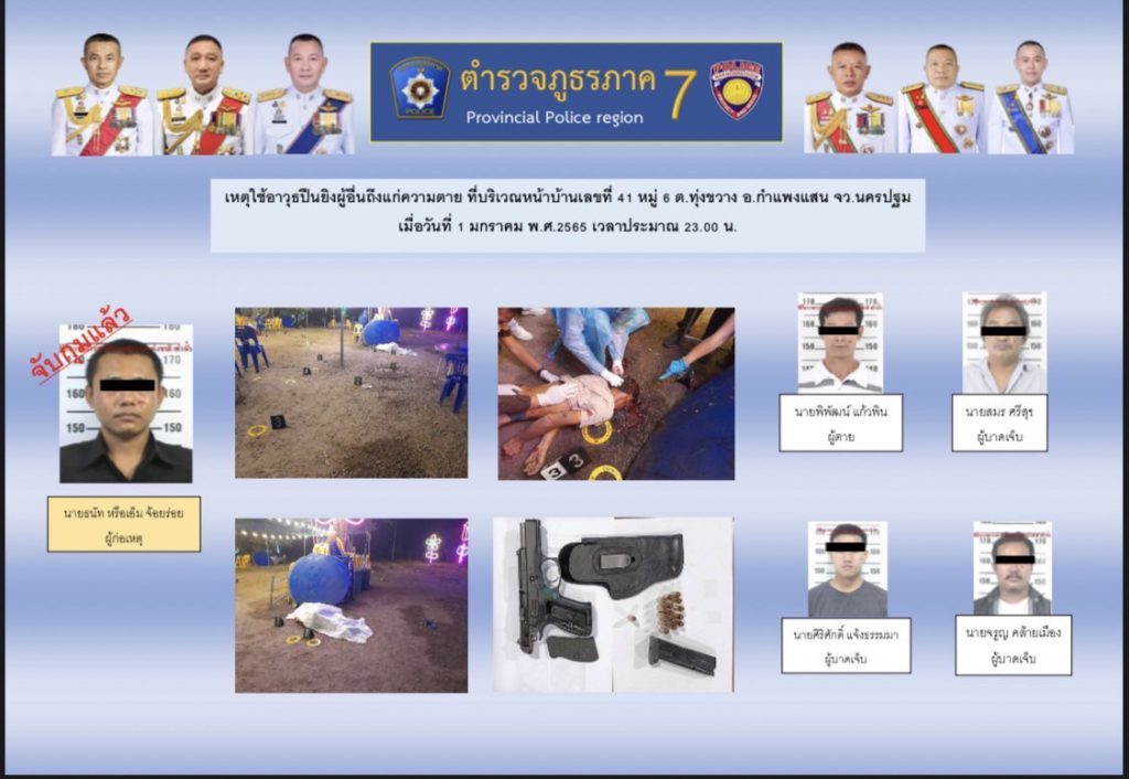 พล.ต.ท.ธนายุตม์ กล่าวว่า สำหรับคดีดังกล่าวด้วยเมื่อวันที่ 1 ม.ค.2565 เวลาประมาณ 23.00 น. ได้รับแจ้งว่าที่บริเวณหน้าบ้านเลขที่ 41 หมู่ 6 ต.ทุ่งขวาง อ.กำแพงแสน จ.นครปฐม มีผู้ถูกยิงด้วยอาวุธปืนเสียชีวิต 1 รายและบาดเจ็บอีก 3 ราย หลังก่อเหตุคนร้ายได้ขับรถยนต์เก๋งยี่ห้อฮอนด้า รุ่นชิตี้ สีเทา หลบหนีไปจากที่เกิดเหตุ จากการสืบสวนสอบสวนทราบว่าผู้ก่อเหตุคือ นายธนัท หรือเอ็ม จ้อยร่อย พนักงานสอบสวนจึงได้รวบรวมพยานหลักฐาน ขออนุมัติหมายจับต่อศาลจังหวัดนครปฐม ต่อมาวันนี้ 2 ม.ค. 2565 ชุดสืบสวนได้ติดตามจับกุมตัวนายธนัท หรือเอ็ม จ้อยร่อย พร้อมตรวจยึดอาวุธปืนที่ใช้ก่อเหตุได้ จึงควบคุมตัวผู้ต้องหาพร้อมของกลาง ส่งพนักงานสอบสวน สภ.กำแพงแสน เพื่อดำเนินการตามกฎหมายต่อไป