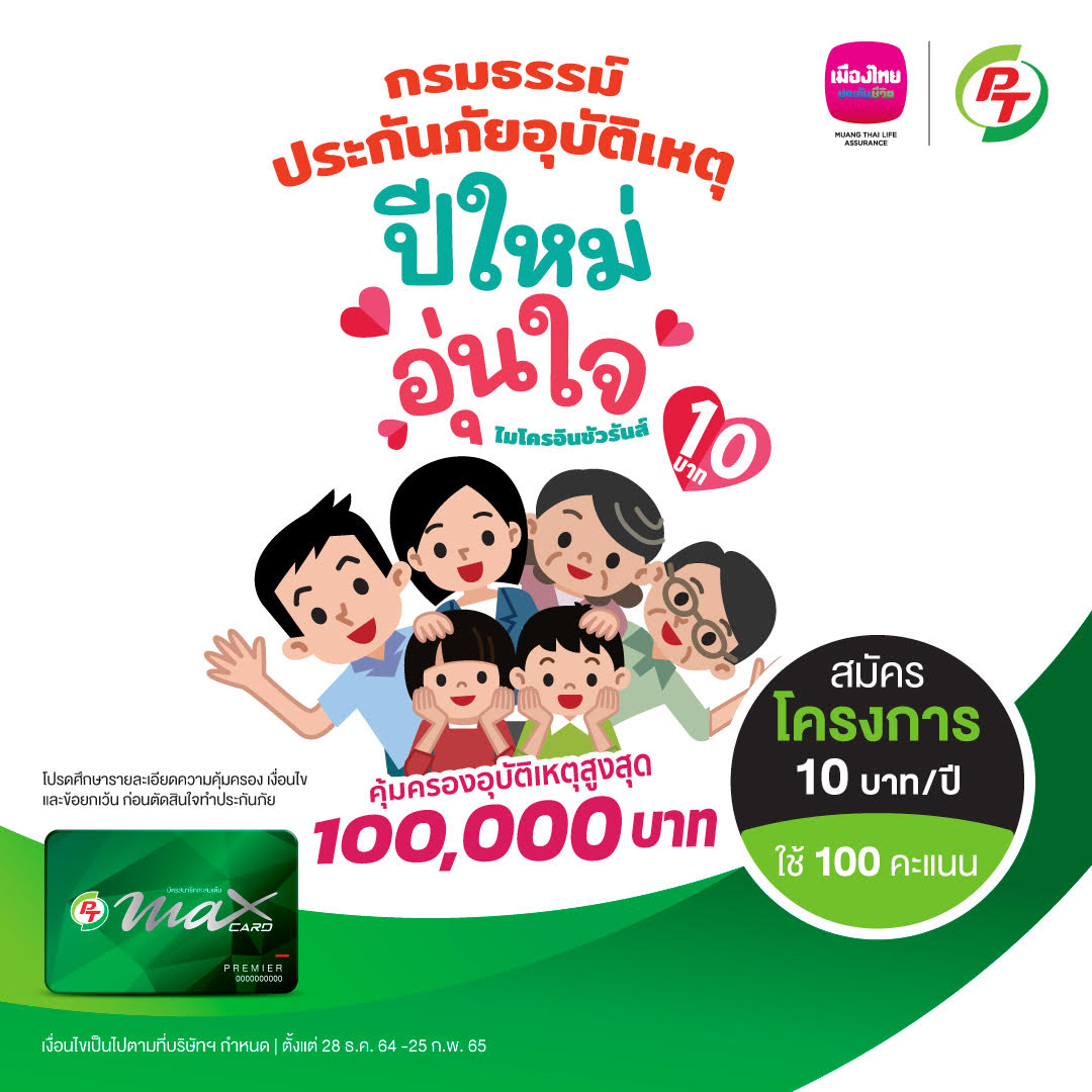 ดร.สุทธิพล ทวีชัยการ เลขาธิการคณะกรรมการกำกับและส่งเสริมการประกอบธุรกิจประกันภัย (คปภ.) พร้อมด้วย นายสาระ ล่ำซำ ประธานเจ้าหน้าที่บริหาร บริษัท เมืองไทยประกันชีวิต จำกัด (มหาชน) และ นายรังสรรค์ พวงปราง กรรมการ บริษัท แมกซ์ การ์ด จำกัด ร่วมมอบความสุขและความอุ่นใจในช่วงเทศกาลปีใหม่ ผ่าน “กรมธรรม์ประกันภัยอุบัติเหตุปีใหม่อุ่นใจ (ไมโครอินชัวรันส์)” ประกันภัยอุบัติเหตุกลุ่มที่ให้ความคุ้มครองครอบคลุมทั้งด้านชีวิตและค่าชดเชยรายได้ให้กับสมาชิก PT Max Card เพียงสมาชิก PT Max Card ใช้คะแนน 100 คะแนน แลกรับสิทธิ์ผ่านช่องทางแอปพลิเคชัน PT Max Rewards (ไม่จำกัดสิทธิ์ / สมาชิก ซึ่งผู้รับความคุ้มครองต้องไม่ใช่บุคคลเดียวกัน)