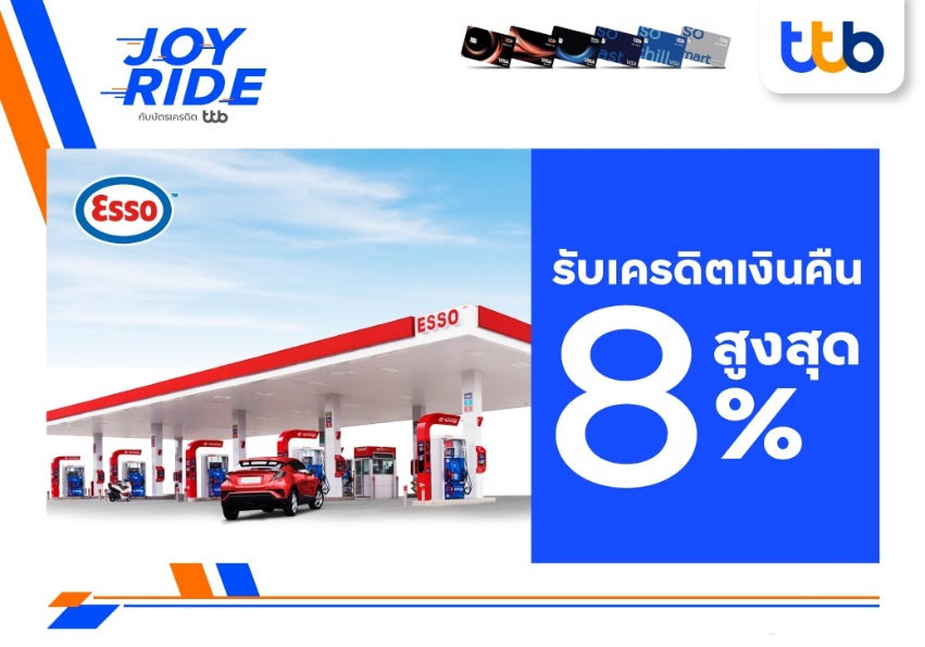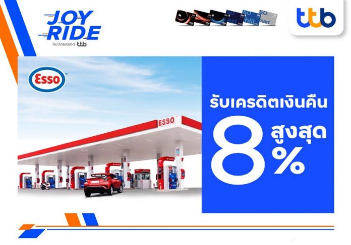 บัตรเครดิตทีทีบี เพิ่มความคุ้มค่าในทุกการใช้จ่ายมอบโปรโมชั่นพิเศษ เมื่อเติมน้ำมัน 700 บาทขึ้นไป/เซลส์สลิป ที่ปั๊มน้ำมันเอสโซ่ (Esso)ทั่วประเทศรับเครดิตเงินคืนสูงสุด 8% จำกัด 2 สิทธิ์ /บัญชีบัตรหลัก/เดือนตั้งแต่วันนี้ถึง 30 มิถุนายน 2565