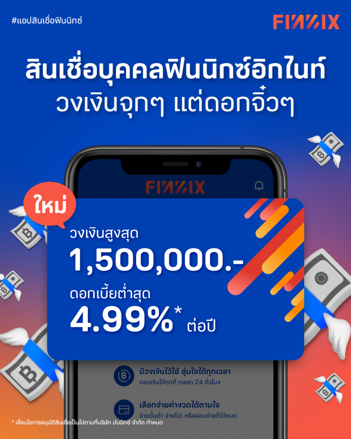 ทั้งนี้ สินเชื่อส่วนบุคคล “ฟินนิกซ์ อิกไนท์” ให้วงเงินสูงสุด 5 เท่าของรายได้ แต่ไม่เกิน 1,500,000 บาท โดยผู้ที่ได้รับอนุมัติสินเชื่อยังสามารถเลือกวันที่ชำระเงินกู้คืนได้ตามใจ และสามารถเลือกชำระคืนแบบไหนก็ได้ในแต่ละเดือน ไม่ว่าจะจ่ายขั้นต่ำ จ่ายตามใจ หรือ ผ่อนจ่ายเป็นงวดนานสูงสุดถึง 60 เดือน โดยมีดอกเบี้ยต่ำสุดเพียง 4.99% ต่อปี แบบลดต้นลดดอก นอกจากนี้ ผู้กู้ที่ถอนเงินออกไปเท่าไร จ่ายดอกเบี้ยเท่านั้น ไม่มีค่าธรรมเนียมวงเงินใดๆ เพียงแค่ดาวน์โหลดแอปพลิเคชันฟินนิกซ์ (FINNIX) สมัครง่ายและรู้ผลไวสุดภายใน 1 วันเท่านั้น