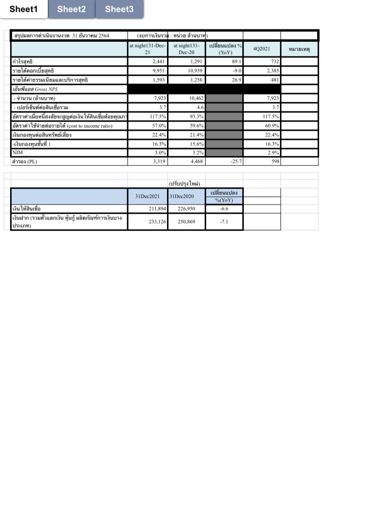ผลการดำเนินงานของกลุ่มธนาคาร สำหรับปีสิ้นสุดวันที่ 31 ธันวาคม 2564 มีกำไรสุทธิจำนวน 2,440.6 ล้านบาท เพิ่มขึ้นจำนวน 1,150 ล้านบาท หรือร้อยละ 89.1 เมื่อเปรียบเทียบผลกำไรสุทธิของงวดเดียวกันปี 2563 สาเหตุหลักเกิดจากการควบคุมค่าใช้จ่ายที่ดีขึ้นส่งผลให้ค่าใช้จ่ายในการดำเนินงานลดลงร้อยละ 8.1 และผลขาดทุนด้านเครดิตที่คาดว่าจะเกิดขึ้นลดลงร้อยละ 25.7 ในขณะที่รายได้จากการดำเนินงานลดลงร้อยละ 3.9