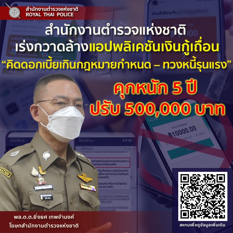 วันที่ 23 มกราคม 2565 พล.ต.ต.ยิ่งยศ เทพจำนงค์ โฆษกสำนักงานตำรวจแห่งชาติ เผยว่า ได้รับการร้องเรียนจากพี่น้องประชาชนว่าได้รับผลกระทบจากแอปพลิเคชันเงินกู้นอกระบบ ซึ่งส่วนใหญ่หากกดยินยอมให้แอปพลิเคชันเข้าถึงข้อมูลก็จะสูญเสียข้อมูลส่วนตัวได้ และจะมีการกรอกข้อมูลส่วนตัวในระบบเพื่อเป็นหลักฐานถึงจะกู้เงินได้ เมื่อได้รับเงินกู้แล้วทางแอปพลิเคชันได้มีการเรียกดอกเบี้ยสูงเกินกฎหมายกำหนด หากชำระหนี้ไม่ตรงตามสัญญา บางรายจะมีการทวงหนี้ด้วยการประจานส่งข้อความไปยังคนรอบตัว หรือบางรายมีการทวงหนี้ด้วยความโหดร้ายทารุณ เกิดความเสียหายทั้งร่างกายและทรัพย์สิน นั้น