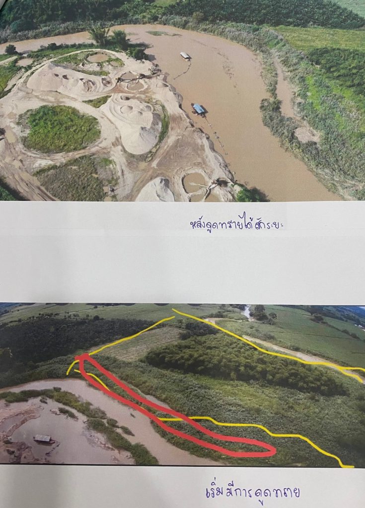 ต่อมาประมาณเดือนพฤศจิกายน 2564 ได้มี กลุ่มนายทุนทำการดูดทรายในพื้นที่ ต่อมาได้นำเรือดูดทรายลงดูดในล่องน้ำ ซึ่งเรือนั้นได้ล่องมาถึงหน้าที่ดินที่ ของกระผม (นายวุฒิกร บัวล้ำเลิศ ถือครองที่ดิน)มีการดูดทราย และ มีการถมทรายลงลำน้ำ ทำให้ ลำน้ำแคบลงและทิศทางการไหลของน้ำ เปลี่ยนทิศทาง ไหลเข้ามาที่บริเวณโค้งที่กระผมถือครอง ทำให้พื้นที่บางส่วน ได้ถูกน้ำพัดไหลลงน้ำ เกิดความเสียหาย ซึ่งกรณีดังกล่าว ได้มีการแจ้ง ผู้ใหญ่บ้าน ให้เข้ามาตรวจสอบ ซึ่งผู้ใหญ่ในพื้นที่ มาดู แล้ว 1 ครั้ง ช่วงประมาณธันวาคม ที่ผ่านมา โดยหลังจากนั้นก็เงียบ และทาง เรือดูดทรายก็ยังคงดำเนินการดูดทรายต่อเนื่องจนถึงปัจจุบัน