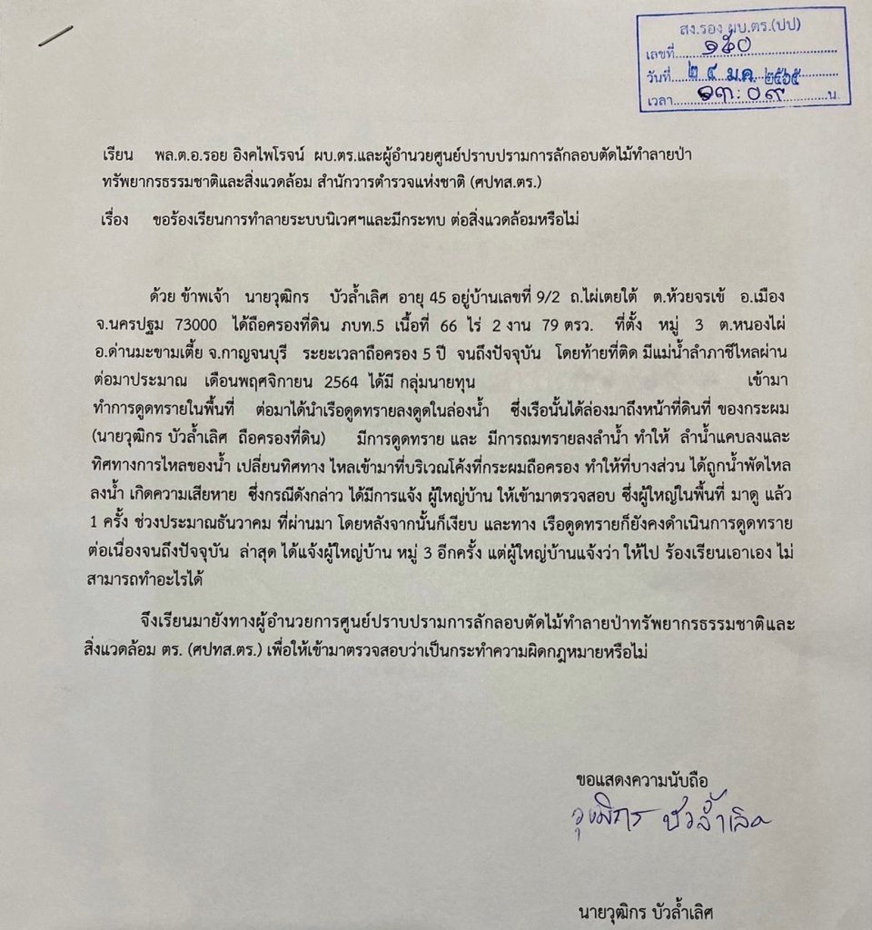เมื่อวันที่ 24 มกราคม 2565 ที่สำนักงานตำรวจแห่งชาติ (ตร.) มีรายงานว่า นายวุฒิกร บัวล้ำเลิศ ได้ยื่นหนังสือถึง พล.ต.อ.รอย อิงคไพโรจน์ รอง ผบ.ตร.(ปป.) ในฐานะ ผู้อำนวยศูนย์ปราบปรามการลักลอบตัดไม้ทำลายป่าทรัพยากรธรรมชาติและสิ่งแวดล้อม สำนักวารตำรวจแห่งชาติ (ศปทส.ตร.) เรื่อง ขอร้องเรียนการทำลายระบบนิเวศฯ และมีกระทบต่อสิ่งแวดล้อมหรือไม่ โดยเนื้อหาในหนังสือดังกล่าวมีใจความระบุว่า ข้าพเจ้านายวุฒิกร บัวล้ำเลิศ อายุ 45 อยู่บ้านเลขที่ 9/2 ถ.ไผ่เตยใต้ ต.ห้วยจรเข้ อ.เมือง จ.นครปฐม 73000 ได้ถือครองที่ดิน ภบท.5 เนื้อที่ 66 ไร่ 2 งาน 79 ตรว. ที่ตั้ง หมู่ 3 ต.หนองไผ่ อ.ด่านมะขามเตี้ย จ.กาญจนบุรี ระยะเวลาถือครอง 5 ปี จนถึงปัจจุบัน โดยท้ายที่ติด มีแม่น้ำ ลำภาชีไหลผ่าน