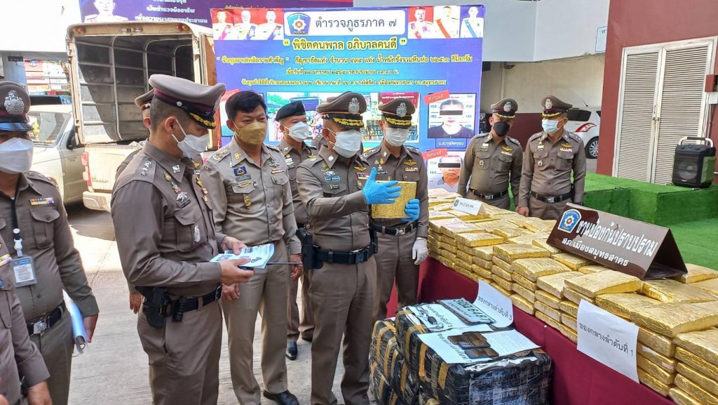 ผบช.ภ.7 พร้อมด้วย พล.ต.ต.พิสิฐ ตันประเสริฐ รอง ผบช.ภ.7, พล.ต.ต.อภิชาติ วรรณภักดิ์ ผบก.ภ.จว.สมุทรสาคร, นายณภัทร์ เอมอ่อน นายอำเภอเมืองสมุทรสาคร, พ.ต.อ.ธนากร วงศ์สิริลักษณ์ ผกก.สภ.เมืองสมุทรสาคร และเจ้าหน้าที่ที่เกี่ยวข้อง ได้ร่วมกันแถลงข่าวการจับกุมตัวผู้ต้องหา คือ นายอุดร เพชรรักษา อายุ 42 ปี ผู้ต้องหาที่ 1, นายชาญชัย ไชยบุตร อายุ 39 ปี ผู้ต้องหาที่ 2, น.ส.กรษิพรรณ สุขปัน อายุ 34 ปี ผู้ต้องหาที่ 3 และนายประกอบ เพชรักษา อายุ 66 ปี ผู้ต้องหาที่ 4 ในข้อหาความผิดฐาน “ร่วมกันจำหน่ายเพื่อการค้า และก่อให้เกิดการแพร่กระจายในกลุ่มประชาชน ซึ่งยาเสพติดให้โทษประเภท 5 (กัญชา) โดยการมีไว้ในครอบครองเพื่อจำหน่ายโดยไม่ได้รับอนุญาต, ปลอมและใช้เอกสารปลอม” โดยจับกุมเมื่อวันที่ 22 ม.ค. 65 เวลา 13.10 น. บริเวณถนนพระราม 2 ขาออก กม.ที่ 42 ต.บาโทรัด อ.เมืองสมุทรสาคร จ.สมุทรสาคร