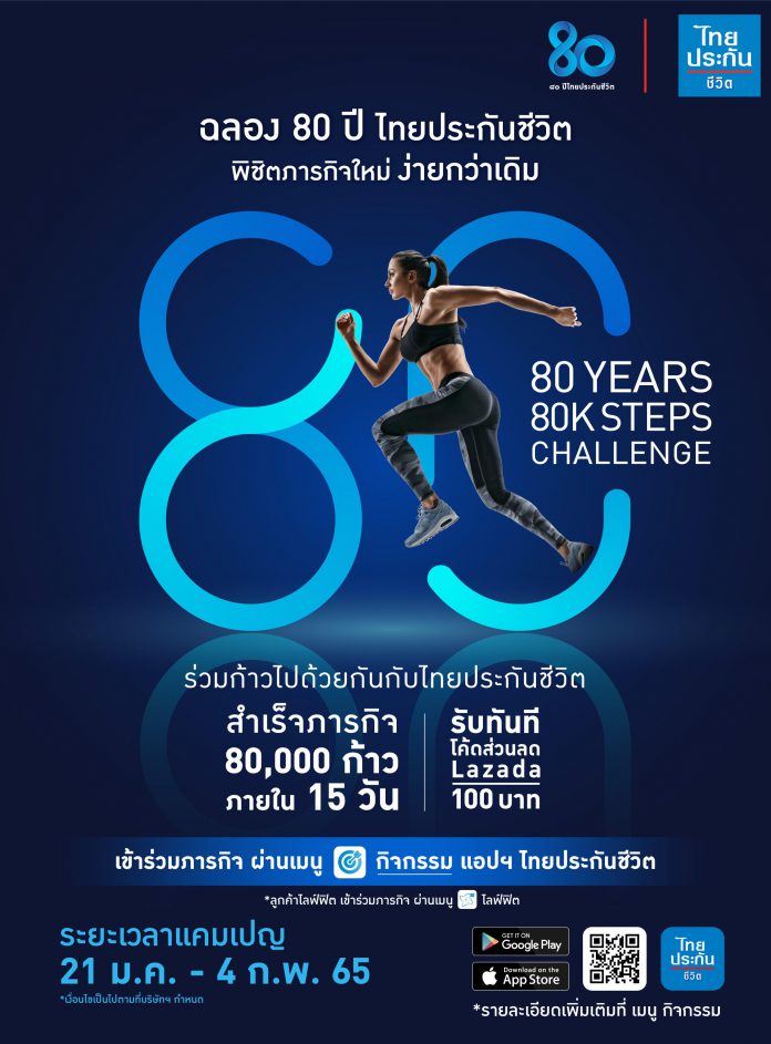 ดังนั้นเพื่อร่วมส่งเสริมการดูแลสุขภาพ พร้อมร่วมฉลอง 80 ปี ไทยประกันชีวิต บริษัทฯ จึงได้กิจกรรม “80 ปี ไทยประกันชีวิต พิชิตภารกิจ 80,000 ก้าว” ชวนลูกค้าไทยประกันชีวิต และสมาชิกไลฟ์ฟิตร่วมสะสมก้าวเดินให้ครบ 80,000 ก้าว ภายใน 15 วัน ทำภารกิจสำเร็จรับทันทีโค้ดส่วนลด Lazada มูลค่า 100 บาท โดยสามารถร่วมกิจกรรมผ่านแอปพลิเคชัน ไทยประกันชีวิต ตั้งแต่วันนี้ – 4 กุมภาพันธ์ 2565