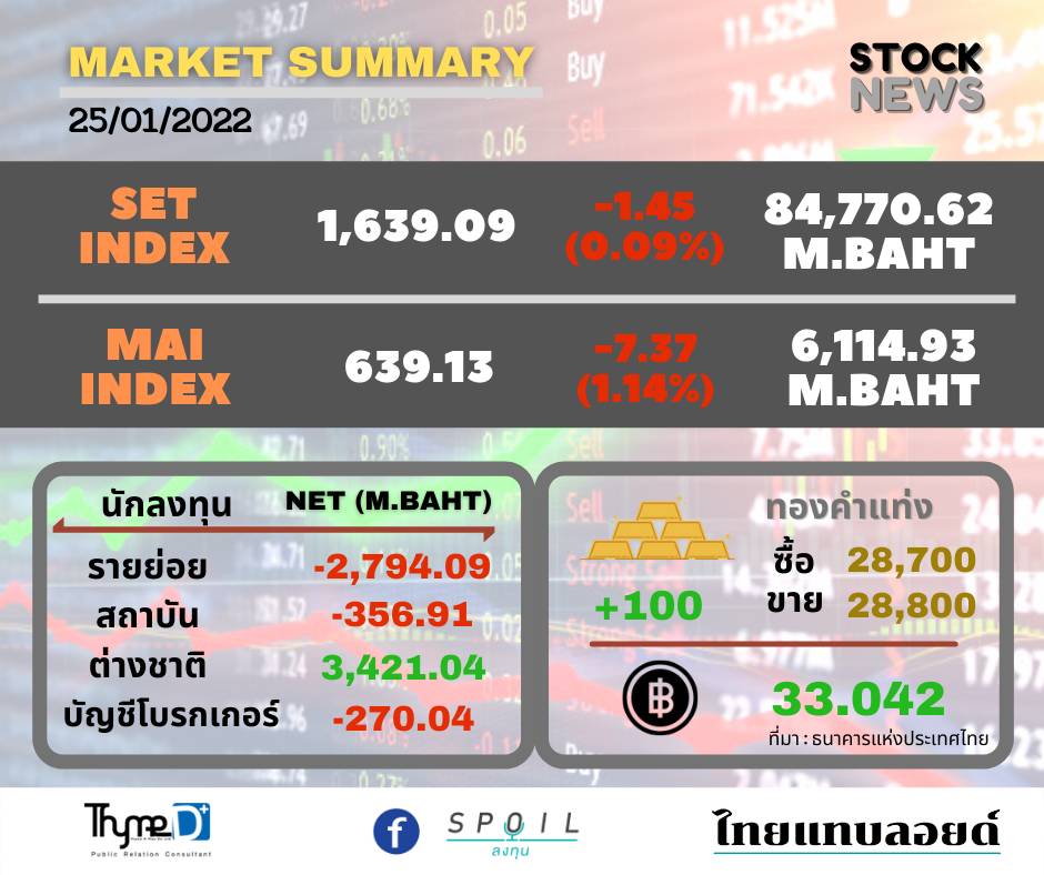 ตลาดหลักทรัพย์ ปิดวันนี้ที่ระดับ 1,639.09 จุด ลดลง 1.45 จุด (-0.09%) มูลค่าการซื้อขาย 84,770.62 ล้านบาท