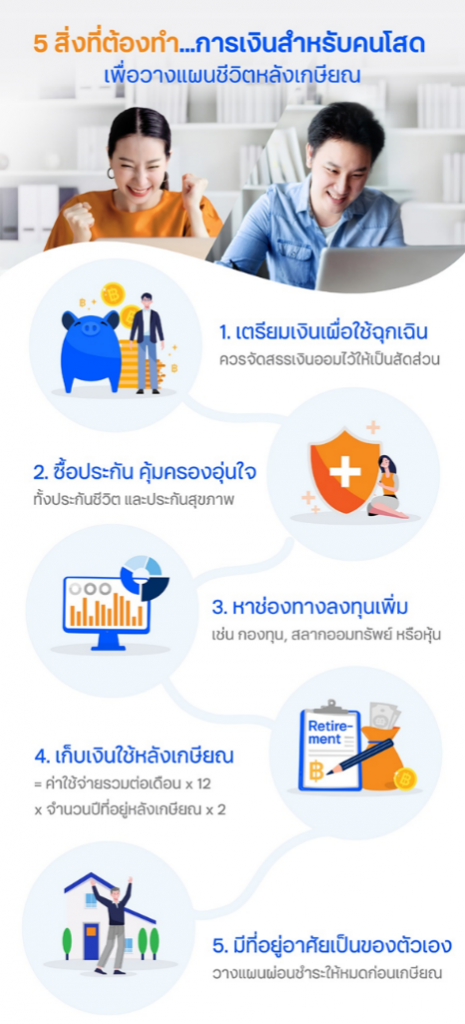 อย่างไรก็ตาม ทั้งหญิงโสด และชายโสด ก็ต้องมีการวางแผนชีวิตไม่ต่างจากคนมีครอบครัว ครอบคลุมถึงเรื่องการเงินด้วยเช่นกัน เพื่อให้เราสามารถใช้จ่ายได้แบบสบาย ๆ เตรียมตัวให้พร้อมที่จะใช้ชีวิตโสดอย่างมีคุณภาพ มีชีวิตการเงินที่ยั่งยืน มีเงินเก็บพร้อมใช้จ่ายสบาย ๆ ยามเกษียณ