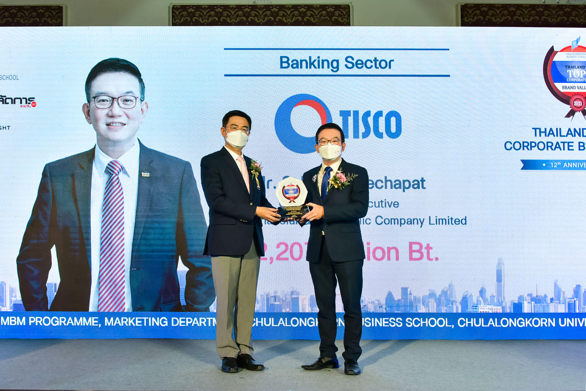 นายศักดิ์ชัย พีชะพัฒน์ ประธานเจ้าหน้าที่บริหารกลุ่มทิสโก้ รับรางวัลเกียรติยศ Thailand’s Top Corporate Brands 2021 จากศาสตราจารย์ ดร.บัณฑิต เอื้ออาภรณ์ อธิการบดี จุฬาลงกรมหาวิทยาลัย ในฐานะองค์กรที่มีมูลค่าแบรนด์สูงสุดในหมวดธุรกิจธนาคาร สะท้อนถึงคุณภาพการดำเนินธุรกิจที่ กลุ่มทิสโก้ มุ่งเน้นการเติบโตอย่างมั่นคงและยั่งยืน ในงาน ASEAN and Thailand’s Top Corporate Brands 2021 ณ อาคารมหาจุฬาลงกรณ์ จุฬาลงกรณ์มหาวิทยาลัย กรุงเทพฯ
