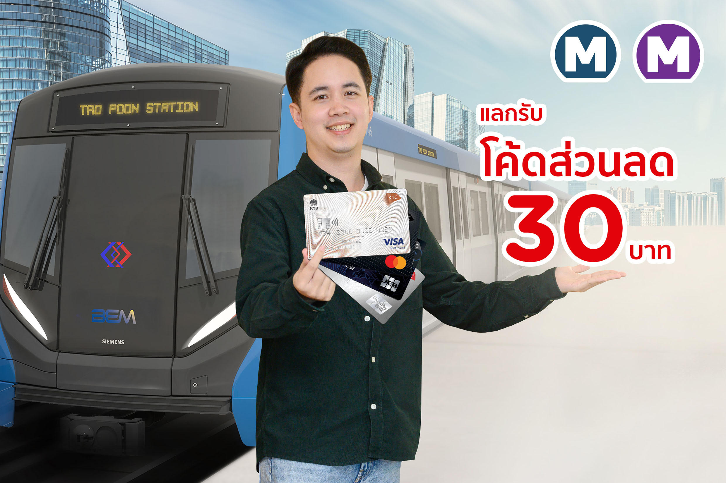 “เคทีซี” หรือ บริษัท บัตรกรุงไทย จำกัด (มหาชน) จับมือ “BEM” (Bangkok Expressway and Metro) หรือ บริษัท ทางด่วนและรถไฟฟ้ากรุงเทพ จำกัด (มหาชน) และ “MRTA” (Mass Rapid Transit Authority of Thailand) หรือ การรถไฟฟ้าขนส่งมวลชนแห่งประเทศไทย (รฟม.) มอบโค้ดส่วนลด 30 บาท เมื่อสมาชิกเติมเงินบัตรโดยสารรถไฟฟ้าทุกประเภทด้วยบัตรเครดิตเคทีซี 400 บาทขึ้นไป โดยสมาชิกสามารถรับโค้ดส่วนลดผ่านแอป KTC Mobile สำหรับบริการรถไฟฟ้าสายสีน้ำเงิน ทุกสถานี รวมถึงรถไฟฟ้าสายสีม่วง ทุกสถานี ตั้งแต่วันที่ 1 กุมภาพันธ์ 2565 – 31 ธันวาคม 2565