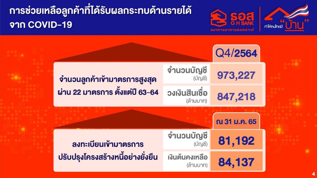 “ใช้จริง” ด้วยผลิตภัณฑ์สินเชื่อที่หลากหลายและอัตราดอกเบี้ยต่ำ นำโดยโครงการบ้านล้านหลัง ระยะที่ 2 อัตราดอกเบี้ยคงที่ 4 ปีแรกเท่ากับ 1.99% ต่อปี สำหรับผู้ที่ต้องการที่อยู่อาศัยในระดับราคาซื้อ-ขายไม่เกิน 1.2 ล้านบาท ล่าสุด ณ วันที่ 17 มกราคม 2565 เวลา 9.00 น. มีลูกค้าลงทะเบียนเข้าร่วมโครงการแล้ว 78,028 ราย คิดเป็นวงเงินสินเชื่อ 93,633 ล้านบาท ยื่นคำขอกู้แล้ว 8,020 ราย วงเงิน 7,021 ล้านบาท และได้รับอนุมัติสินเชื่อแล้ว 7,174 ราย วงเงิน 6,093 ล้านบาท และยังเตรียมนำเงินที่ได้จากการจำหน่ายสลากออมทรัพย์ มาจัดทำเป็นผลิตภัณฑ์สินเชื่อโดยตรงในลักษณะเดียวกันกับ Peer-to-Peer Lending (P2P) ที่เชื่อมโยงเงินระหว่างผู้มี Wealth มาเจอกันกับผู้ต้องการขอสินเชื่อ ส่วนการ “บอกต่อ” โดยการจัดทำโครงการ “Data Driven Analytic” การนำฐานข้อมูลการใช้บริการของลูกค้ามาวิเคราะห์และจัดผลิตภัณฑ์หรือโปรโมชั่นให้ตรงกับความต้องการ พร้อมทั้งให้ความสำคัญกับการรักษาบ้านให้กับลูกค้าที่ประสบอุบัติเหตุมีปัญหาการผ่อนชำระด้วยช่องทางการติดต่อประนอมหนี้ผ่าน Application : GHB ALL Be Friend รวมถึงมาตรการปรับปรุงโครงสร้างหนี้อย่างยั่งยืน ซึ่งถือเป็นสิ่งที่สะท้อนความเข้าใจและอยู่เคียงข้างกับลูกค้าในช่วงที่ประสบปัญหาให้ได้ดีที่สุดต่อไป และนำไปสู่การมี “Loyalty” ที่จะเกิดขึ้นจากการที่ธนาคารมอบความช่วยเหลือลูกค้าในยามวิกฤต นำไปสู่การใช้บริการอย่างต่อเนื่องจากรุ่น สู่รุ่น และยังคงอยู่กับกับ ธอส. ตลอดไป