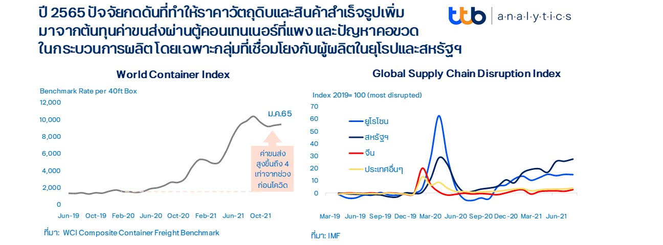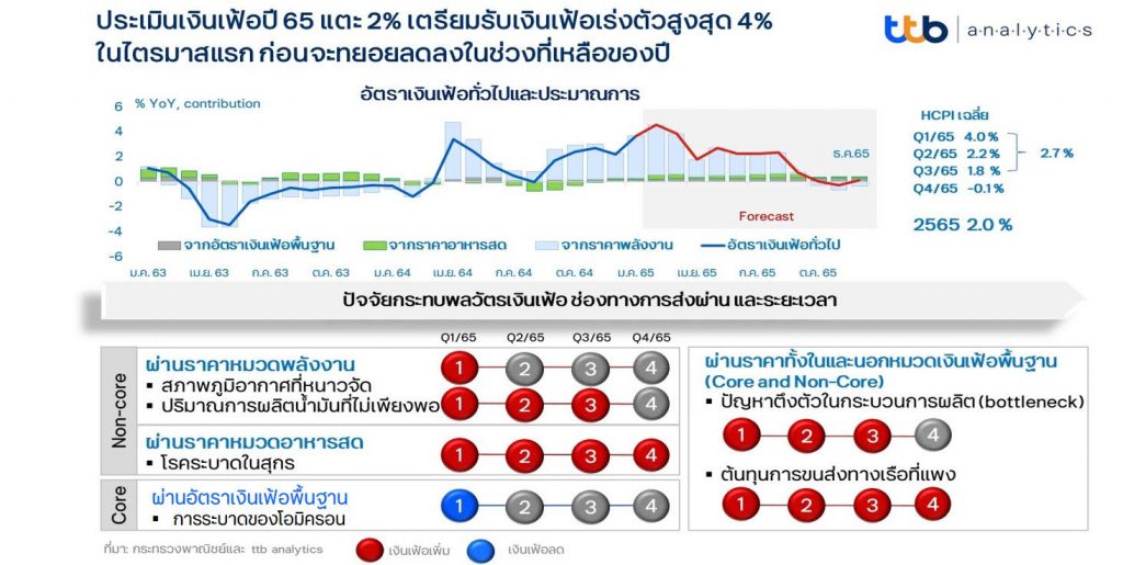 ปัจจัยกดดันด้านสูงจากฝั่งอุปทาน (Cost-push) ทั้งหมดข้างต้น ประกอบกับเงินบาทที่อ่อนค่าลงจากปี 2564 ทำให้ ttb analytics ประเมินว่าอัตราเงินเฟ้อของไทยจะเฉลี่ยอยู่ที่ร้อยละ 2.7 ไปจนถึงสิ้นไตรมาสที่ 3 ปี 2565 นี้ โดยเร่งตัวสูงสุดในไตรมาสแรก และจะทยอยลดลงตลอดไปจนถึงปลายปี หลังปัจจัยต่าง ๆ ทยอยคลี่คลาย โดยอัตราเงินเฟ้อทั่วไปทั้งปีจะเฉลี่ยอยู่ที่ร้อยละ 2.0 โดยปัจจัยเสี่ยงต่อเงินเฟ้อด้านสูงยังมีอยู่จากสาเหตุดังนี้ 1) ปัญหาภูมิรัฐศาสตร์ อาทิ ความขัดแย้งรัสเซีย-ยูเครน ที่อาจทำให้ราคาพลังงานเร่งสูงขึ้นกว่าระดับปัจจุบัน 2) ปัจจัยด้านภูมิอากาศและภัยธรรมชาติที่อาจส่งผลต่อการลดลงของปริมาณผลผลิตการเกษตร 3) ความยืดเยื้อของปัญหาคอขวดในกระบวนการผลิต โดยเฉพาะหากเกิดการแพร่ระบาดจากโรคโควิด-19 สายพันธุ์ใหม่ที่อาจรุนแรงจนทำให้กิจกรรมการผลิตต้องสะดุดลงและกระทบกับภาวะการจ้างงาน