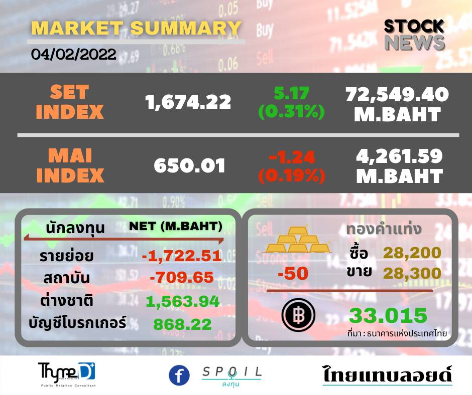 ตลาดหลักทรัพย์ ปิดวันนี้ที่ระดับ 1,674.22 จุด เพิ่มขึ้น 5.17 จุด (+0.31%) มูลค่าการซื้อขาย 72,549.40 ล้านบาท