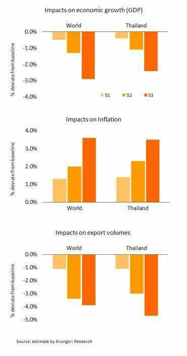 วิจัยกรุงศรีใช้แบบจำลอง Dynamic Stochastic General Equilibrium (DSGE) คำนวณหาผลกระทบต่อเศรษฐกิจโลกและเศรษฐกิจไทย โดยผลต่อไทย พบว่า เศรษฐกิจไทยมีแนวโน้มขยายตัวต่ำกว่าที่คาดไว้ในกรณีฐาน 0.4% 1.1% และ 2.4% ตามลำดับ ส่วนอัตราเงินเฟ้อเร่งตัวกว่าที่่คาดไว้ 1.4% 2.3% และ 3.5% ตามลำดับ ขณะที่ปริมาณการส่งออกลดลงจากกรณีฐาน 1.1% 3.0% และ 4.7% ตามลำดับ