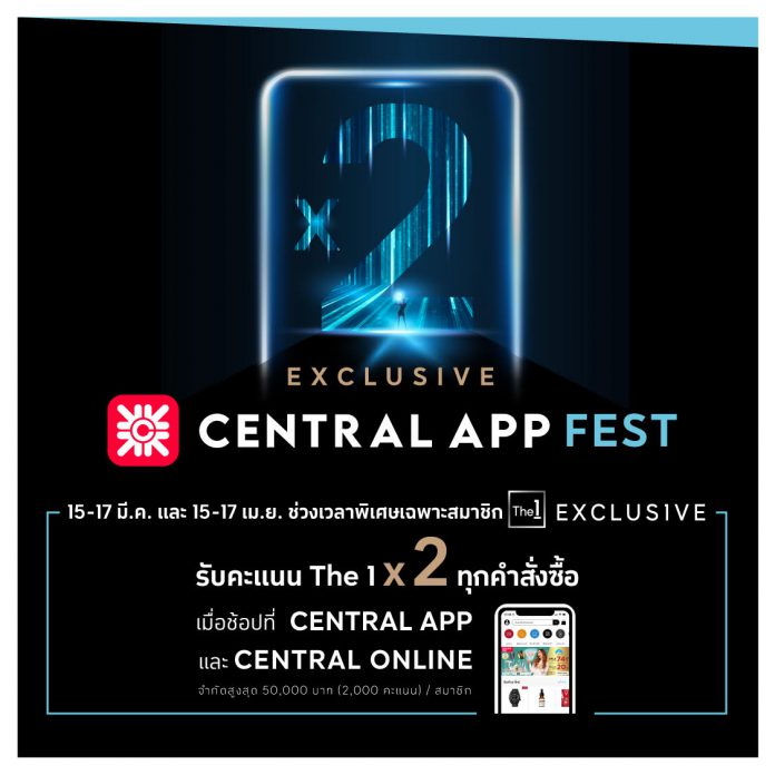 The 1 ผู้นำดิจิทัลไลฟ์สไตล์และลอยัลตี้แพลตฟอร์มอันดับ 1 ของไทย ภายใต้กลุ่มเซ็นทรัล ร่วมมือกับ Central App ปล่อยแคมเปญ “Exclusive Central App Fest” ตอกย้ำกลยุทธ์ Omnichannel ร่วมกระตุ้นยอดการใช้จ่ายออนไลน์ในเครือเซ็นทรัลสำหรับกลุ่มสมาชิก The 1 Exclusive พร้อมยกระดับความคุ้มค่าในการช้อปแบบไร้รอยต่อเพื่อสมาชิก The 1 Exclusive โดยเฉพาะ มอบคะแนนคูณสองทุกออเดอร์ (ยอดรวมสูงสุด 50,000 บาท) เมื่อช้อปผ่าน Central App หรือเว็บไซต์ ‘www.central.co.th’ (จำกัดคะแนนสูงสุด 2,000 คะแนน และจำกัด 1 สิทธิ์ ต่อ 1 สมาชิกตลอดแคมเปญ) ระหว่างวันที่ 15-17 มีนาคม และ 15-17 เมษายน 2565 นี้เท่านั้น