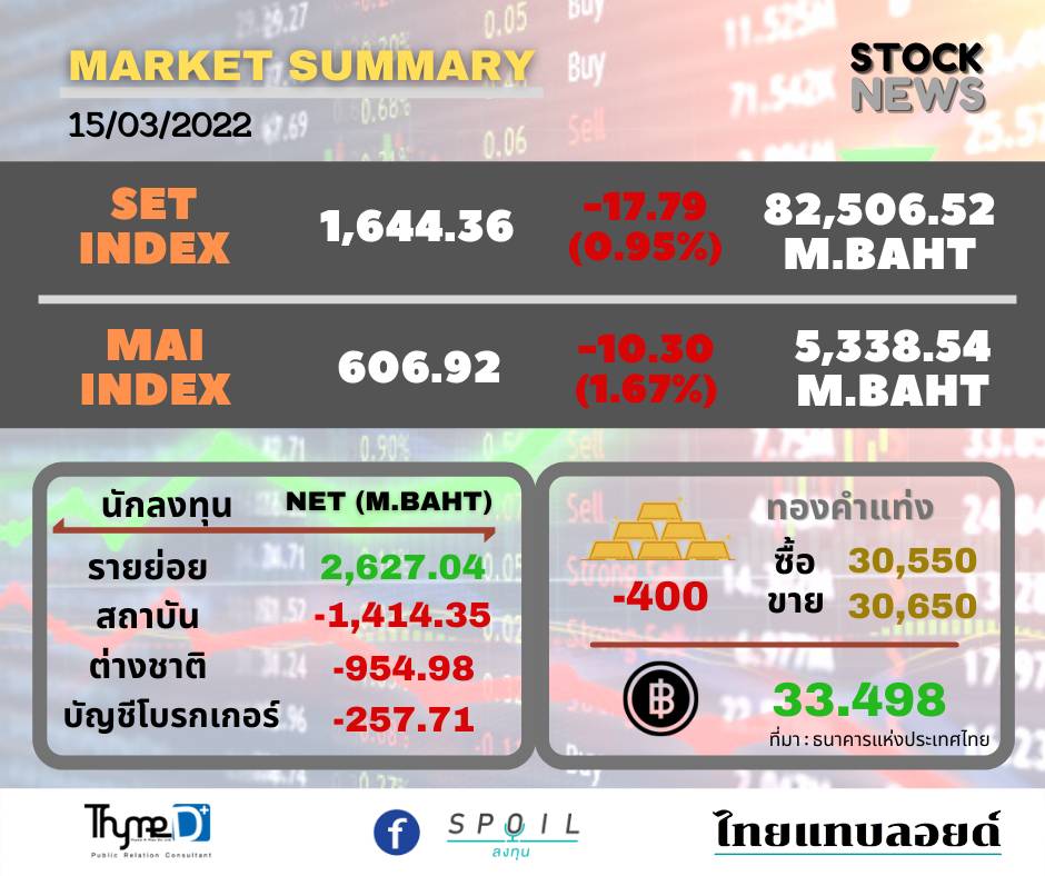 ตลาดหลักทรัพย์ ปิดวันนี้ที่ระดับ 1,644.36 จุด ลดลง 15.79 จุด (-0.95%) มูลค่าการซื้อขาย 82,506.52 ล้านบาท