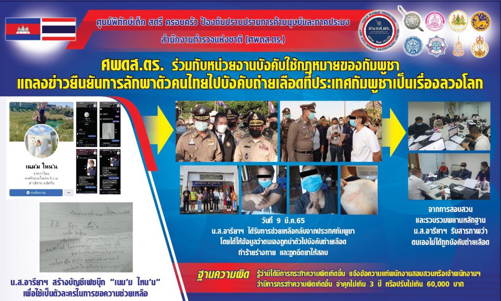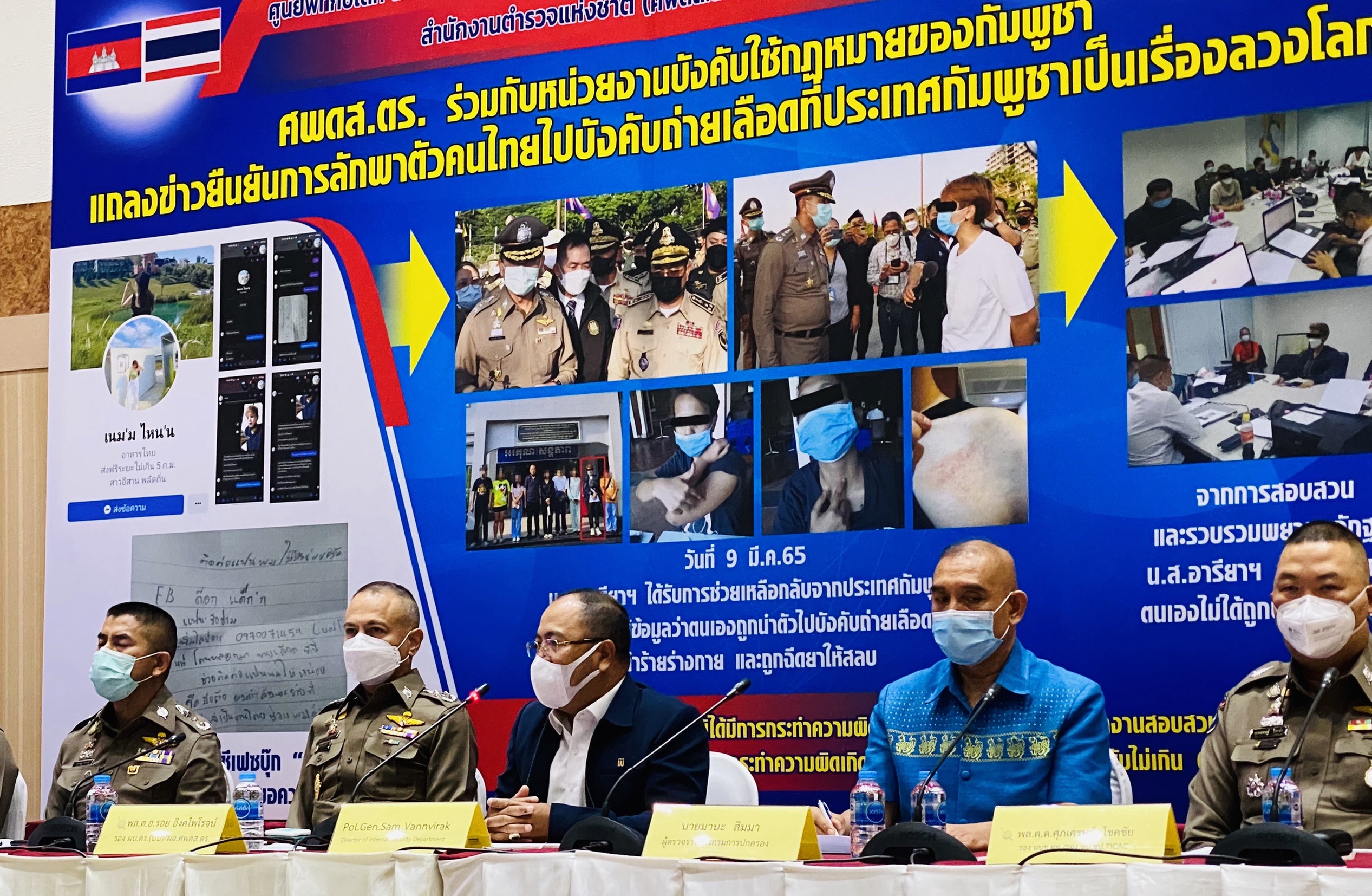 พล.ต.อ.รอย กล่าวว่า กรณนี้ ได้ประสานงานกับหน่วยงานบังคับใช้กฎหมายของประเทศกัมพูชา เข้าช่วยเหลือคนไทยที่ถูกบังคับใช้แรงงาน และสามารถพากลับมาประเทศไทยได้สำเร็จจำนวน 8 ราย หนึ่งในนั้นเป็นหญิงสาวที่อ้างว่า ตนได้ถูกกลุ่มคนร้ายชาวจีนในเมืองพระสีหนุ ประเทศกัมพูชา นำตัวไปบังคับถ่ายเลือดจำนวน 3 ถุง ทั้งยังถูกทำร้ายร่างกาย และถูกฉีดยาทำให้สลบ ก่อนได้รับการช่วยเหลือจนกลับสู่ประเทศไทยได้นั้น กรณีดังกล่าวเป็นที่สนใจของประชาชนและสื่อมวลชนเป็นอันมาก เนื่องจากเป็นกรณีที่มีความทารุณโหดร้ายและสะเทือนขวัญ ในการนี้ พล.ต.อ.สุวัฒน์ แจ้งยอดสุข ผบ.ตร. ตนได้สั่งการให้ พล.ต.ท.สุรเชษฐ์ ให้ดำเนินการสืบสวนข้อเท็จจริงในกรณีดังกล่าว โดยประสานงานกับ พล.ต.อ.วรรณวีระ สม ผู้ช่วยผู้บัญชาการตำรวจกัมพูชา ซึ่งรับผิดชอบงานด้านความมั่นคงเพื่อทำให้ข้อเท็จจริงตามกรณีดังกล่าวปรากฏ ต่อมา พล.ต.ท.สุรเชษฐ์ จึงได้มอบหมายให้ พ.ต.อ.เขมรินทร์ พิศมัย ผกก.ตม.จว.ตราด หัวหน้าชุดเคลื่อนที่เร็ว ศพดส.ตร. สืบสวนข้อเท็จจริงในกรณีดังกล่าวให้ปรากฏโดยเร็ว
